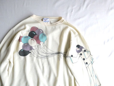薄手のスウェットのような長袖トップスです。前身頃から左袖にかけて風船の束とピエロが大きくプリントされています。左腕を上げ下ろしすると、風船の束にピエロの指先が触れたり離れたりとロマンティックな仕掛け。オフホワイトのボディーにふんわり優しい色味のイラストで可愛らしいアイテム。カットソーとスウェットの間のような生地で、リラックス出来る着心地です。