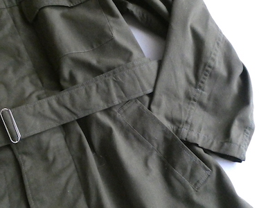 ガブっと大きめのミリタリーベルト付きコートです(恐らくチェコ軍だと思います)コットンポリの比較的しっかりめの生地。膝くらいの丈感で、シングルのトレンチコートようなデザインです。フロントは比翼で内側にジップが付きます。ウエストの絞りが殆どないストンとしたシルエット。ベルト無しでハーフコート感覚でも◎。ドローストリングも腰と裾に付き、ベルトの有無含め気分で色々と変えられそうなのも良いです。袖は少し長めですが、カフス無しなのでロールアップで調節し易いですよ。