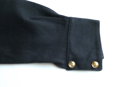 ロシア軍のセーラートップス。薄手のウール素材で裏地無し。胸元にはループボタンが付いていて、閉じると少し立ち上がる小さめの襟になります。袖口には金ボタンが2つ。薄手ウールなので動き易く、肩の張りもそこまで気にならないですよ。テイスト問わず使えそうで、比較的合わせ易い一枚です。