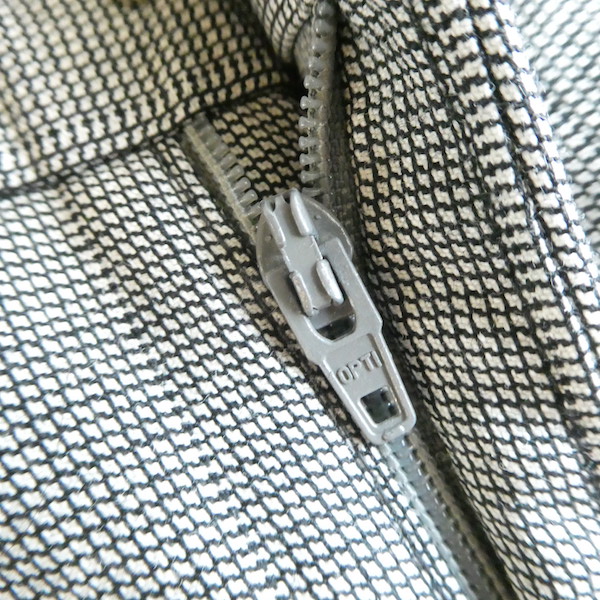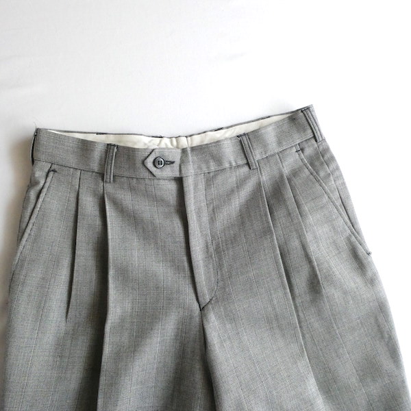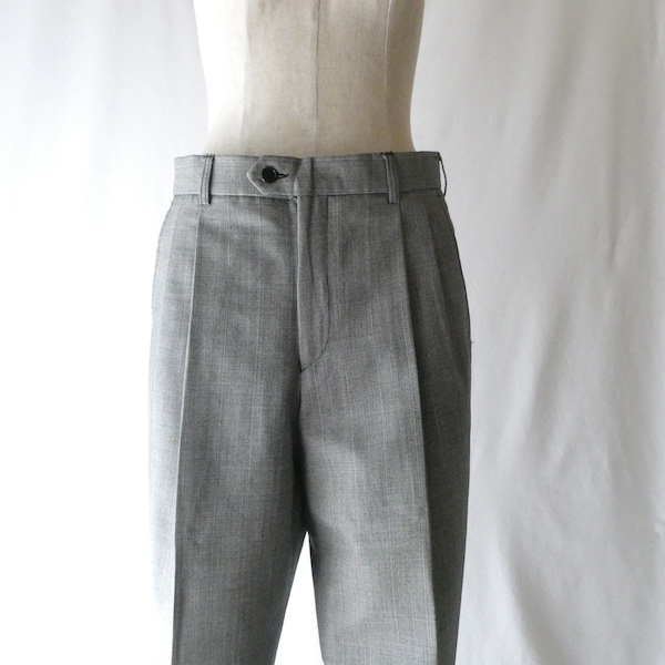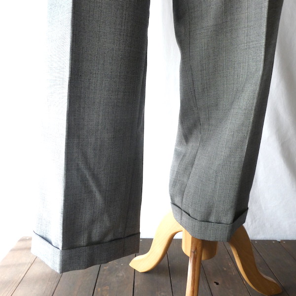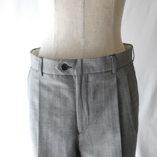 サマーウールのパンツです。黒白の細かな織柄でグレー。極々細かな千鳥格子のような生地です。2タックで内側にはサスペンダーボタン付き。テーパードしないストンと綺麗な太めストレートで着易いですよ。真冬以外の3シーズンは使えそうな素材感です。