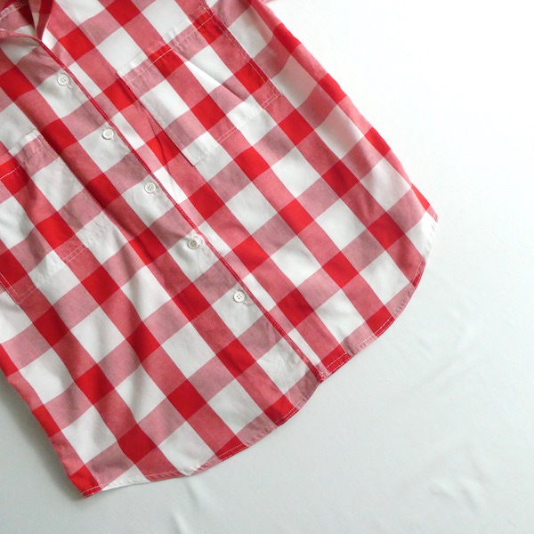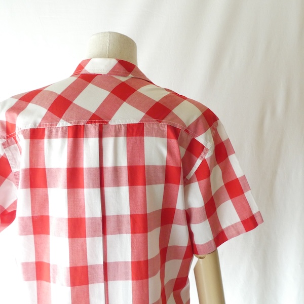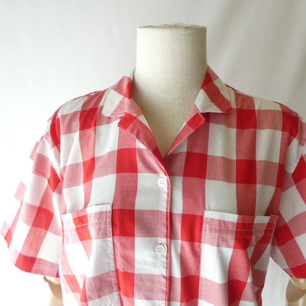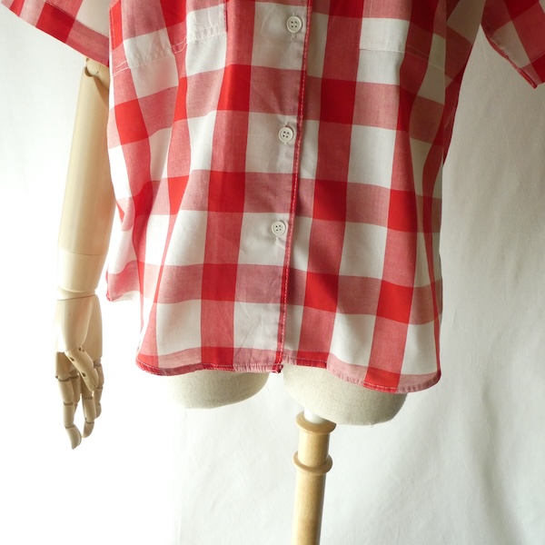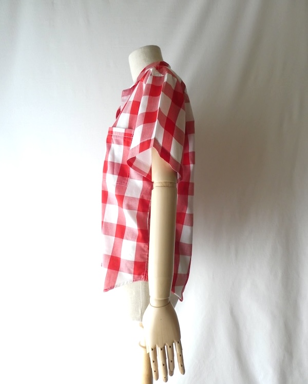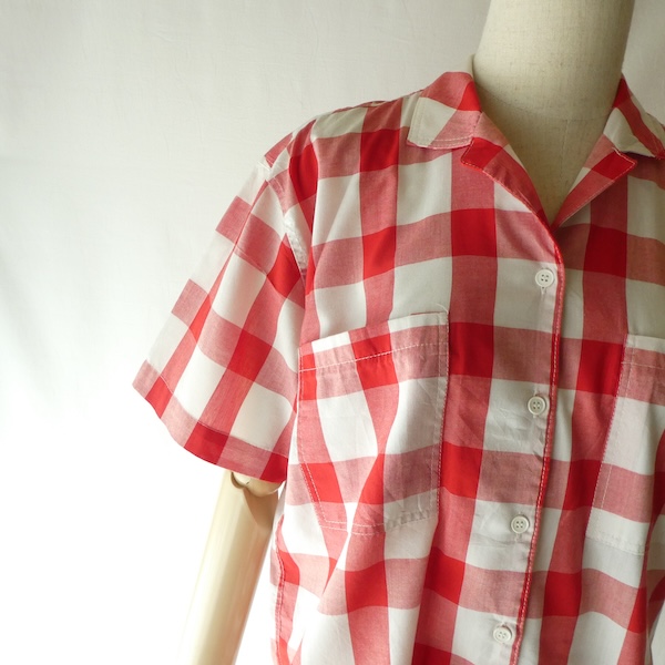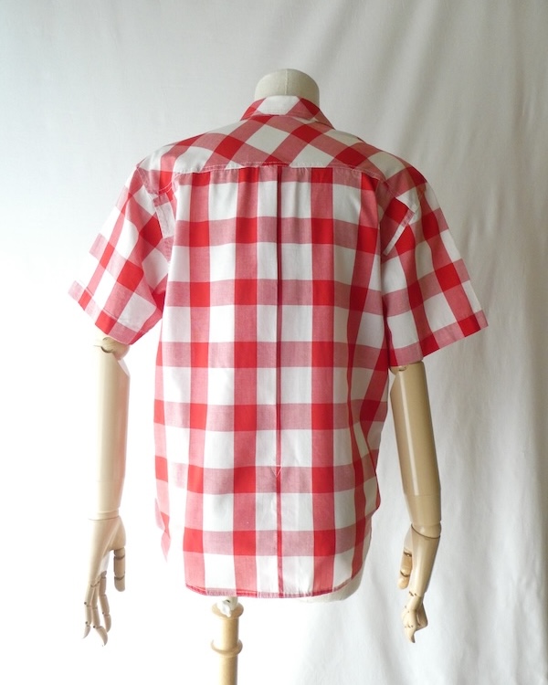 オープンカラーの半袖シャツ。薄手コットンポリ素材の大きめの赤白ギンガムです。オーセンティックな印象ですが、アームホールも広め、ウエストの絞りも無いので着易い印象。きっちりボタン閉じしてイン、もしくはボタンを開けて軽く羽織る。どちらにも丁度良い丈感と身幅です。