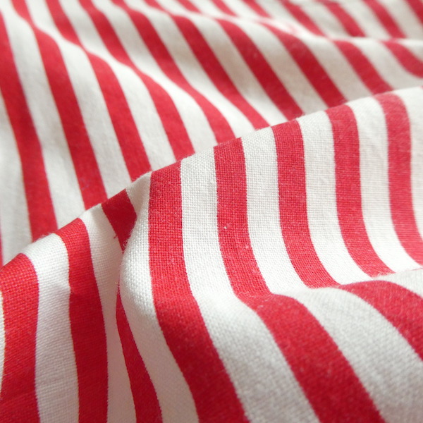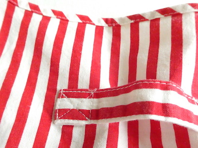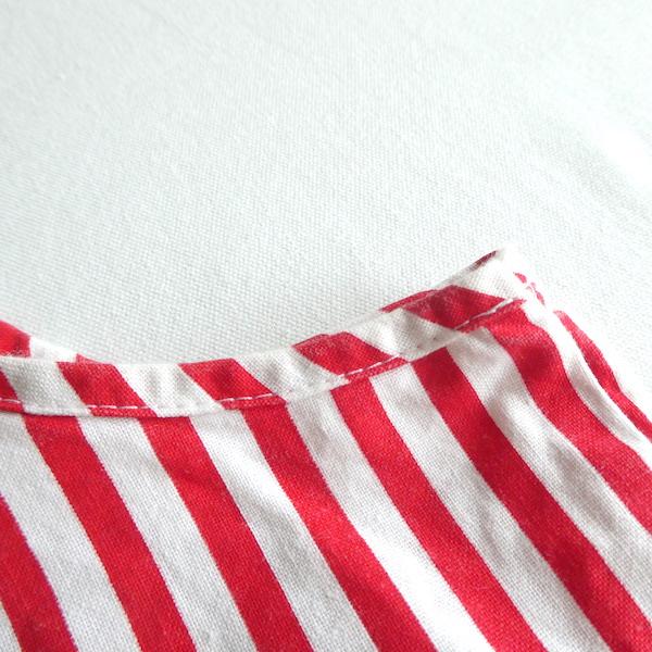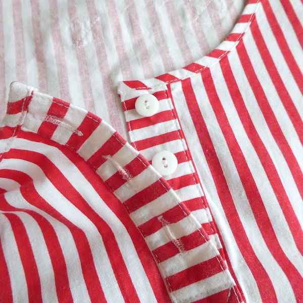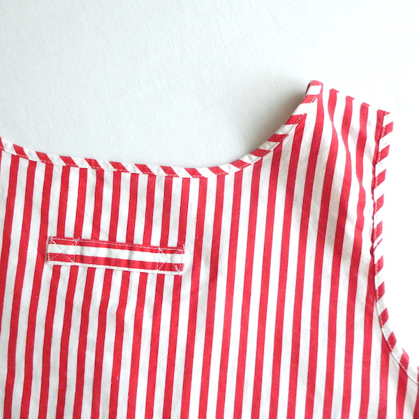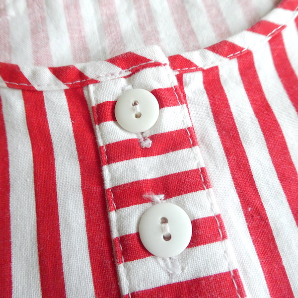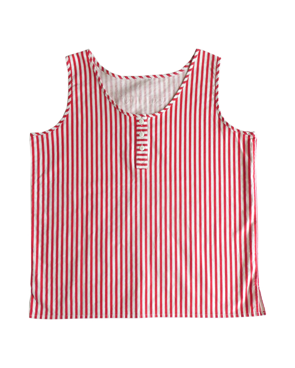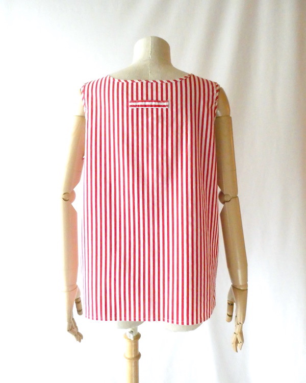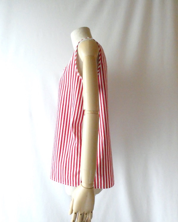胸ボタン付きのタンクトップです。パリッとしたコットンポリ素材。赤白のビビッドなストライプ柄。共布のパイピングや胸ボタン、背中のフック等、シンプルですがディティールが可愛いアイテム。インナーにも一枚でも◎