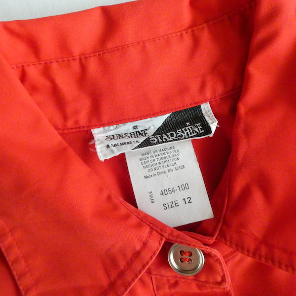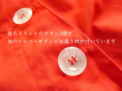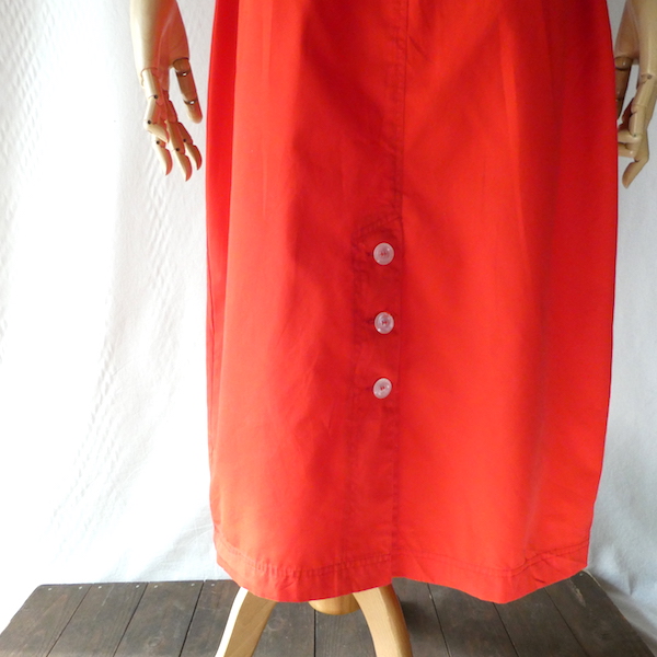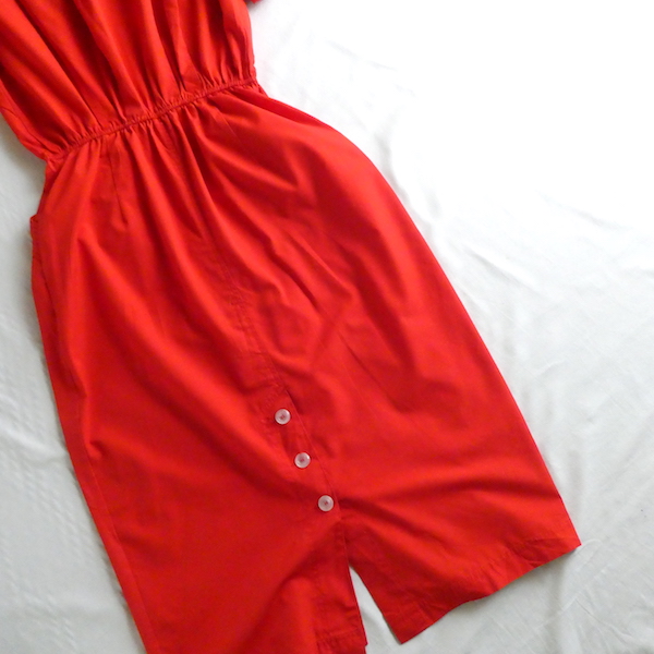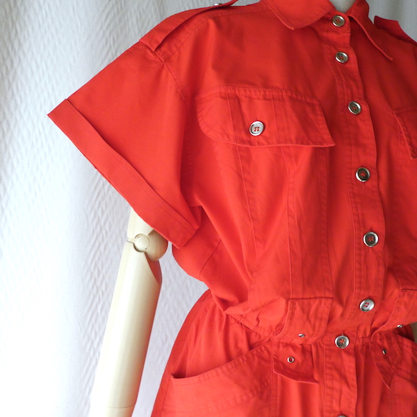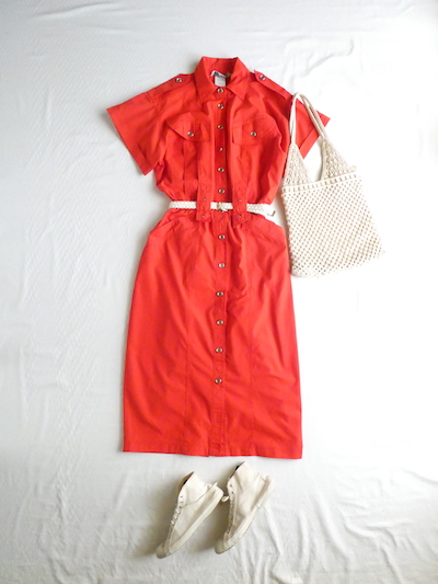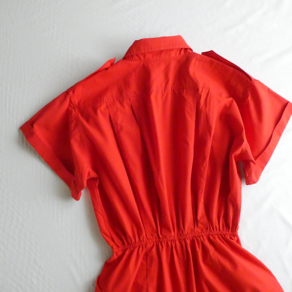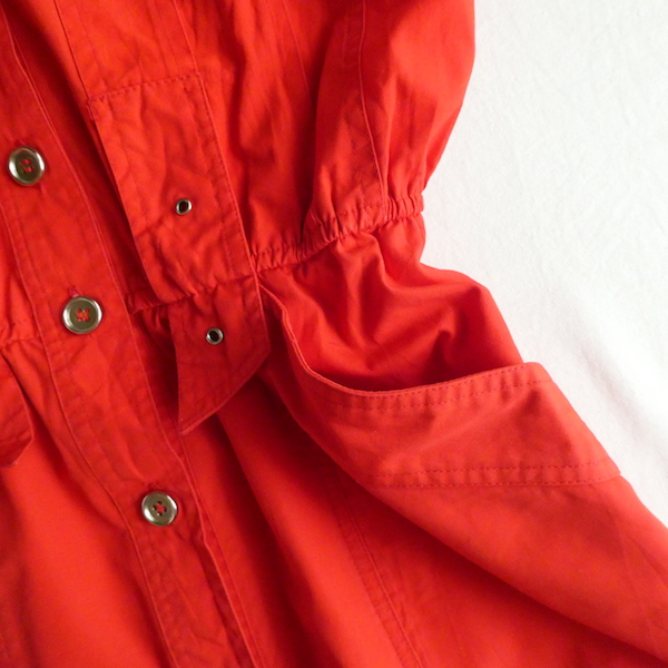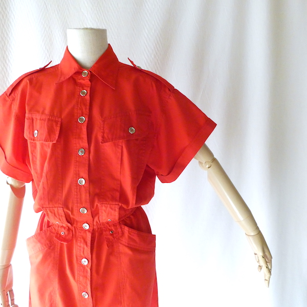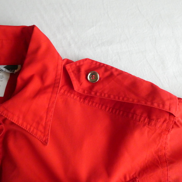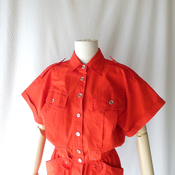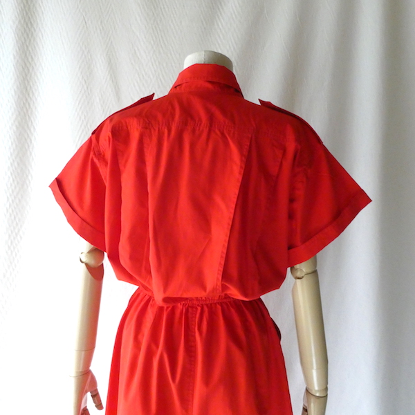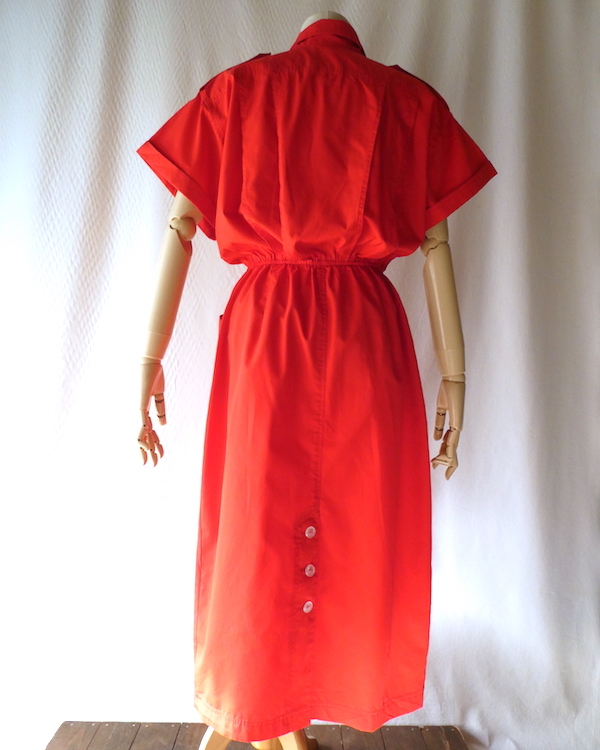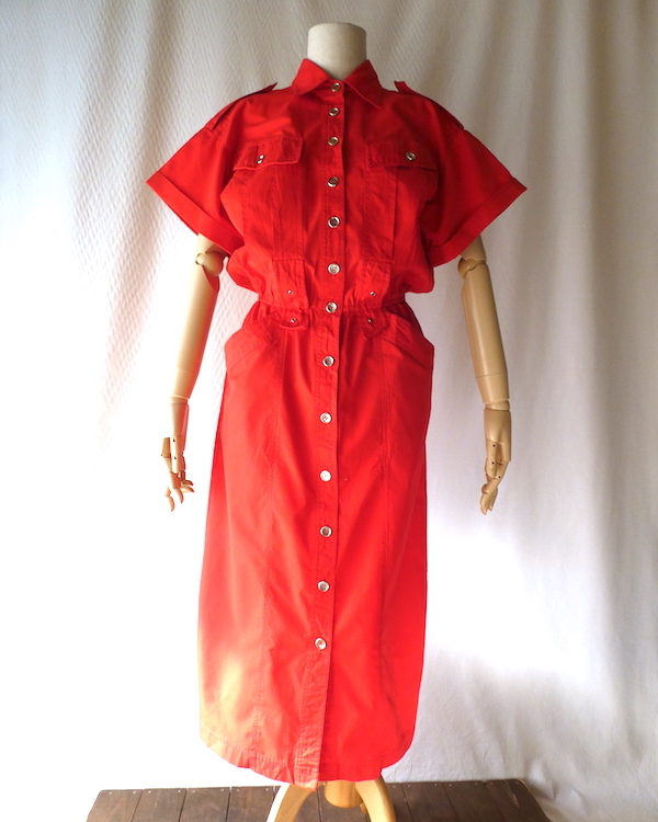 鮮やかなスカーレットカラーの半袖ワンピースです。エポレットにフラップポケットが付くキリッとしたデザインにビビッドな赤。シルバーのボタン部分と後ろスリットは全開するのでレイヤードにも便利です。ハトメのついたベルトループも可愛いですよ。
