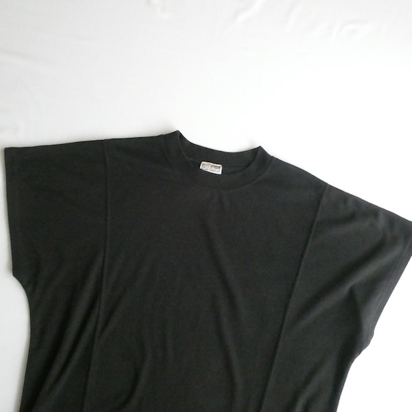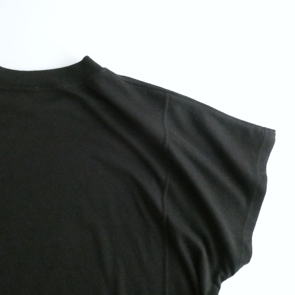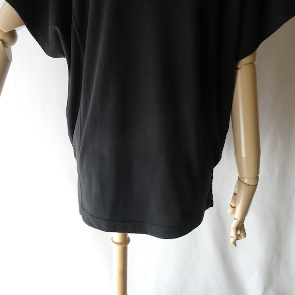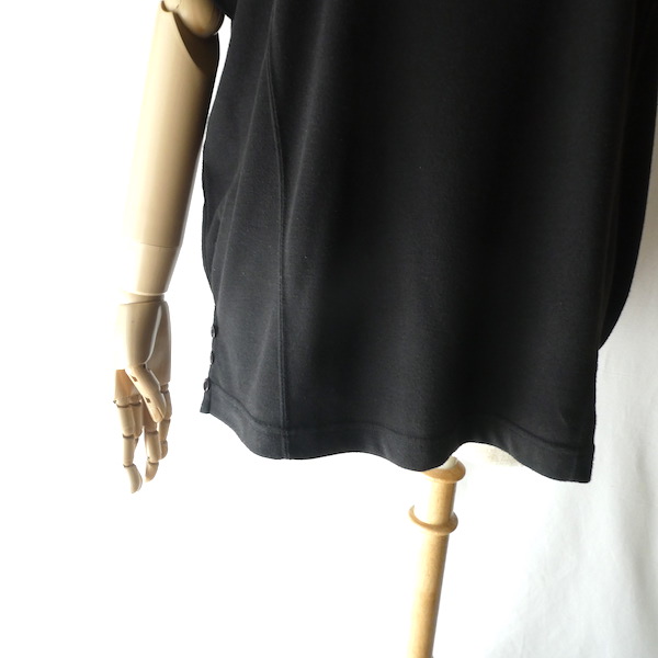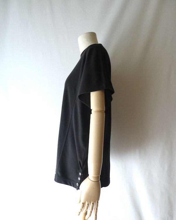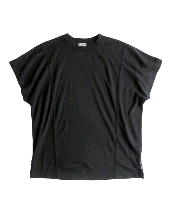 ポリコットンのカットソーです。ゆるっとTシャツスタイルの黒無地で、着まわせて便利な一枚。襟ぐりはTシャツデザイン。フレンチスリーブのように、肩にかかるシルエット。無地ですが、切り替えが入っていたり、両サイドの裾に飾りボタンが付いていたり。然りげ無く一味違った印象です。