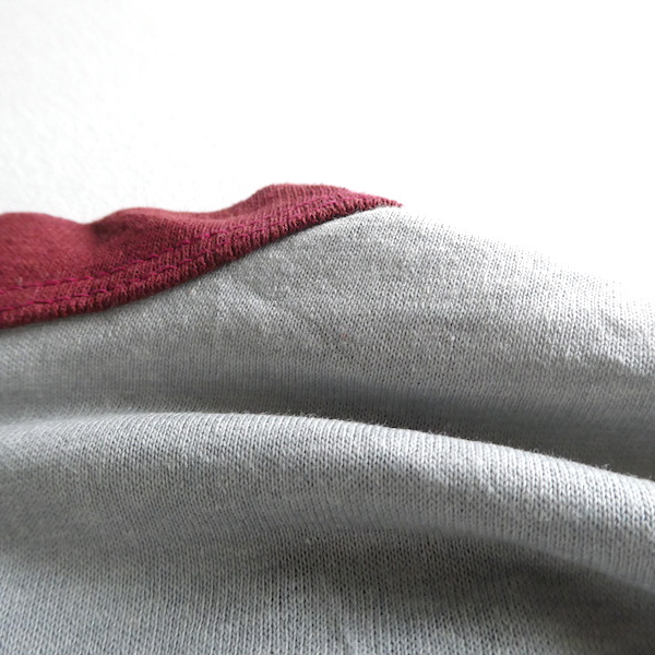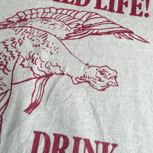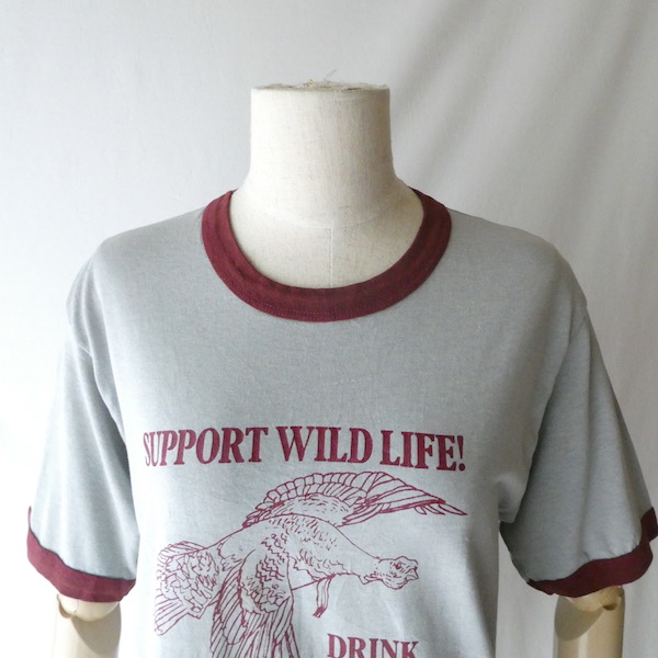 グレーボディーにバーガンディーのトリムTです。バーボンウイスキー『ワイルドターキー』のアドバタイジング物。真ん中に大きく羽を広げたターキーが居ます。比較的身幅狭めでレトロなシルエット。色合わせやプリントの雰囲気も渋めで◎な一枚です。