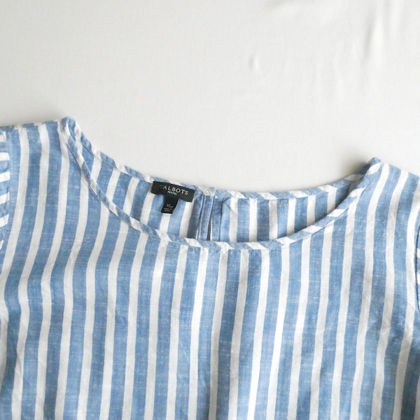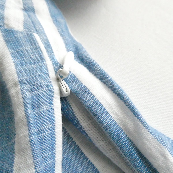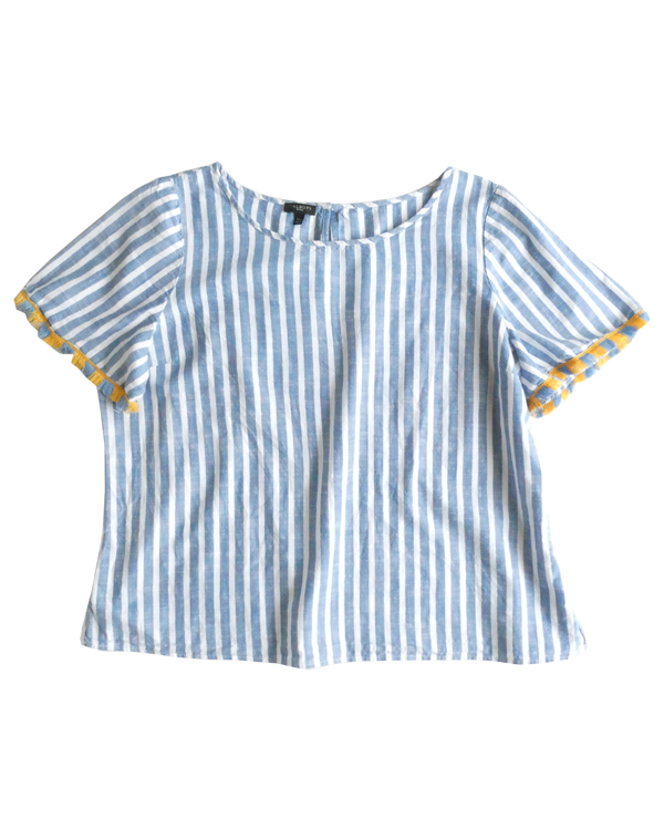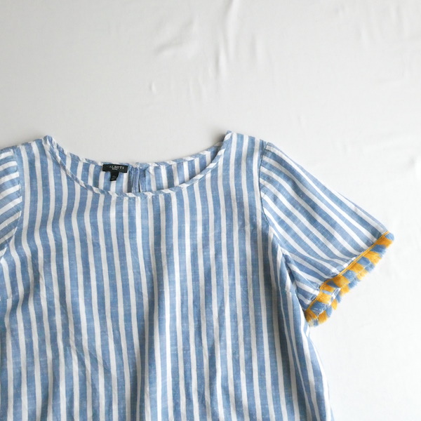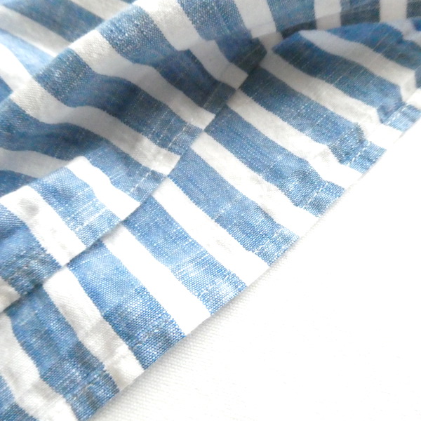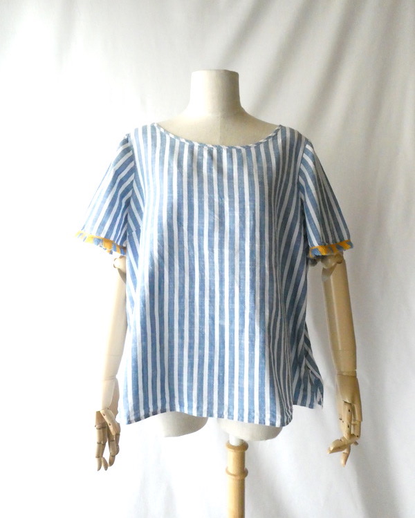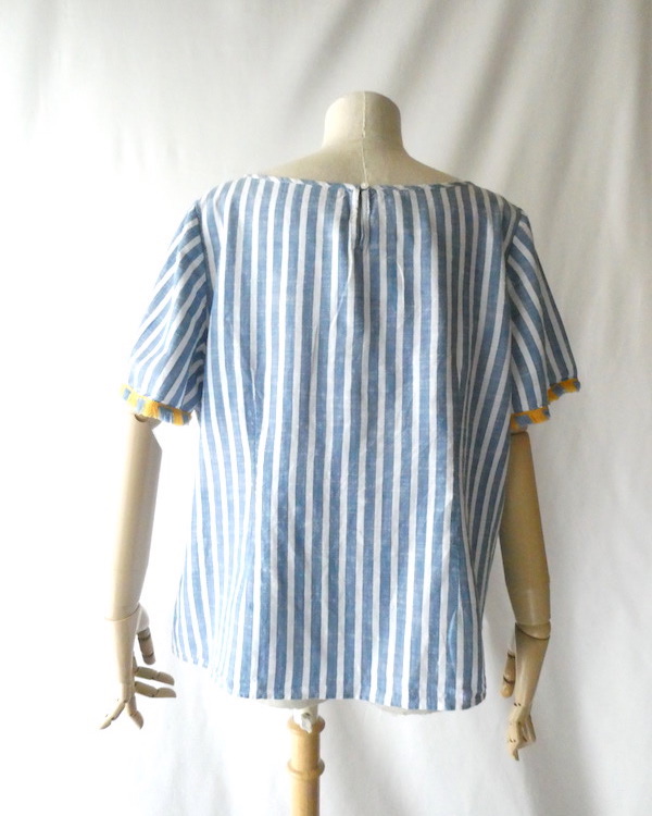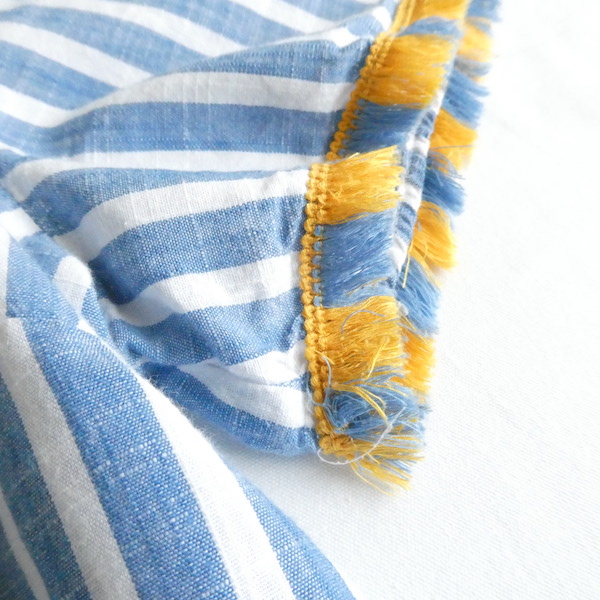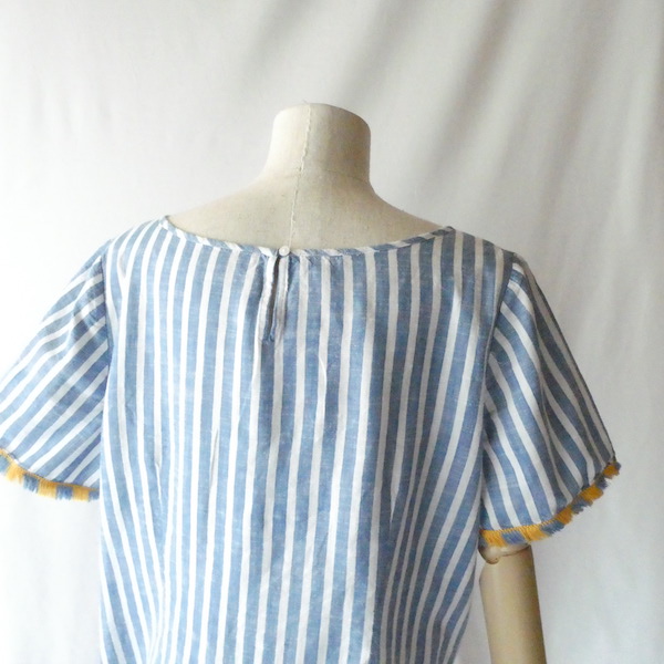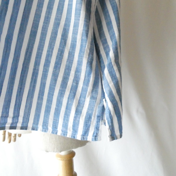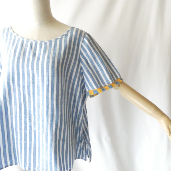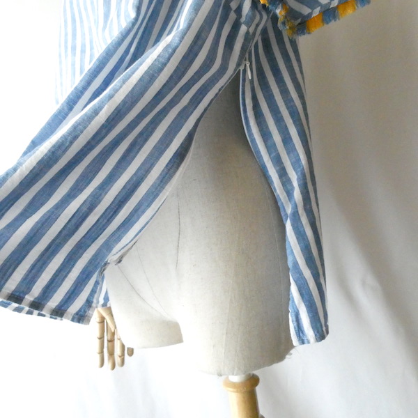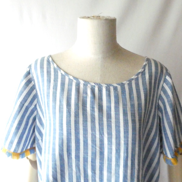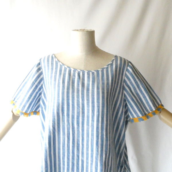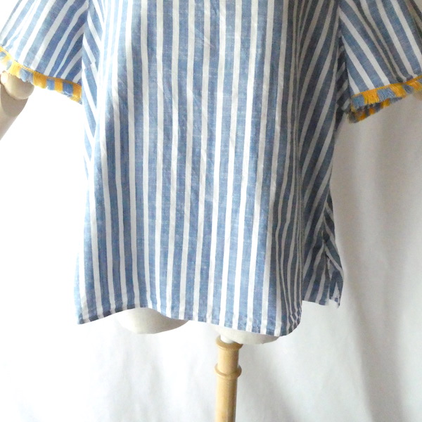 サラッと薄手コットン生地のトップスです。ブルーと白の爽やかなストライプ。袖口についたイエローとブルーのフリンジ可愛いアイテム。身幅も広めで、風が通る涼しい着心地です。左サイドにファスナーが付くので、広がりのあるワンピース等に重ねる際にも便利ですよ。