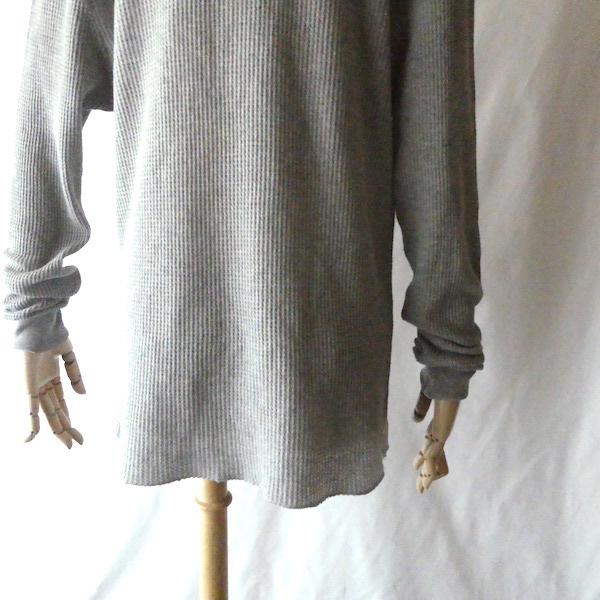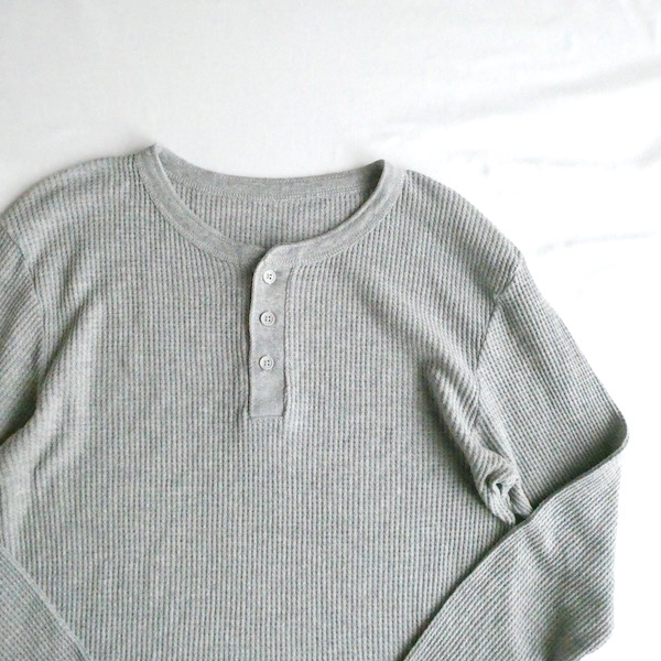 ヘンリーネックの長袖サーマルです。あると便利な使い易いグレー。タイト過ぎず一枚でカットソー代わりに着ても可愛いシルエットです。定番の白は持ってる方、2枚目に如何ですか。