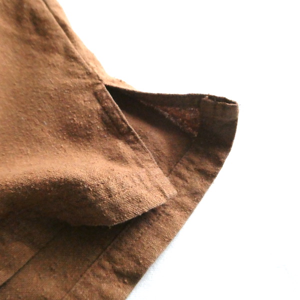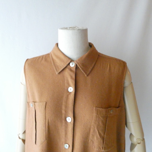 シルク素材のノースリーブです。コットンっぽいの見た目ですがシルク素材。少しざらつきのある荒めの質感です。薄手なのでトップスをインしても、ごわつかないですよ。キャミソール等の上に羽織ったり、しっかり閉じてイン、上から何かを羽織ったりetc…。無地なので着まわせて便利なアイテムです。