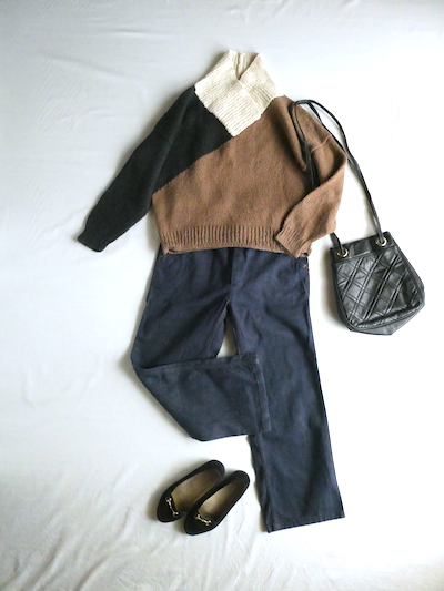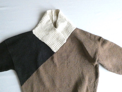 3色使いのコットンニットです。コーヒーブラウン・ベージュ・ブラックの落ち着いた3色。斜めに大胆に切り替えが入ります。首に沿うように立つ襟の形が綺麗なアイテム。身幅広めで短め丈のニットです。さっと一枚で何となく様になるので便利ですよ。