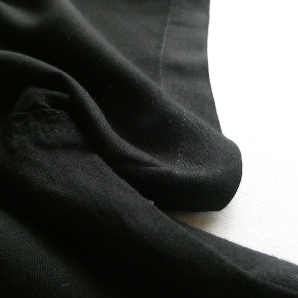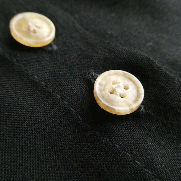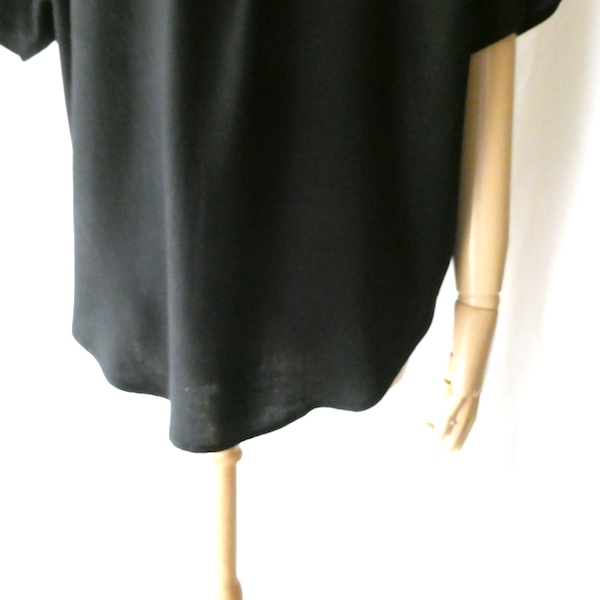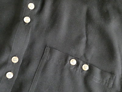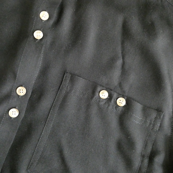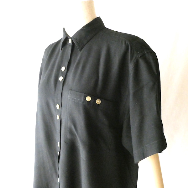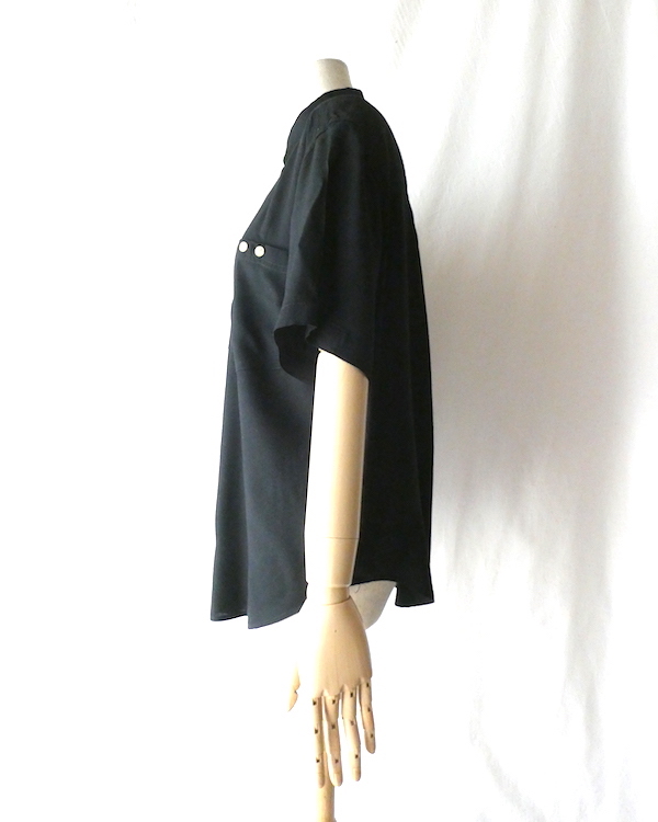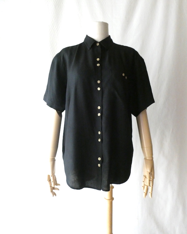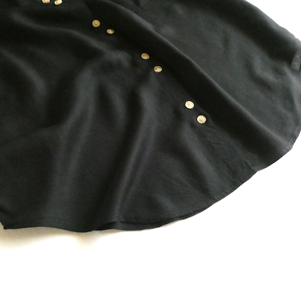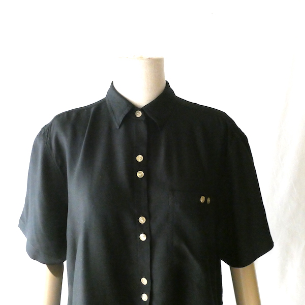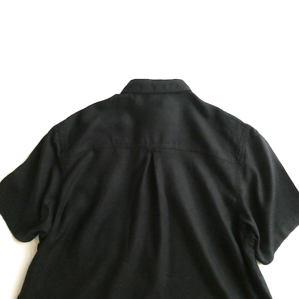 ブラックレーヨンの半袖シャツです。ゆるんと落ち感のあるレーヨン素材。フロントには薄いサンドベージュのべっ甲柄のボタンが並びます。2個づつの並びが可愛いですよ。胸ポケットにも2個。シンプルで着やすいアイテムです。