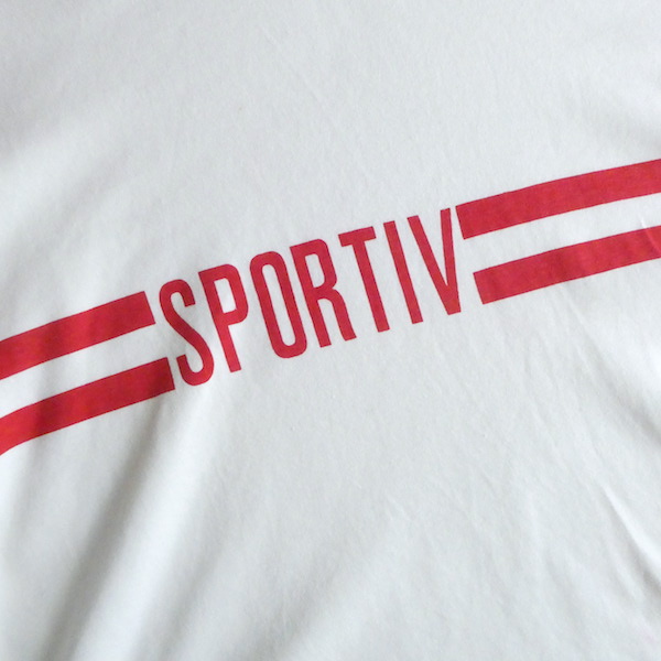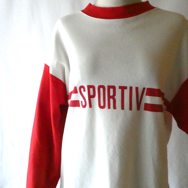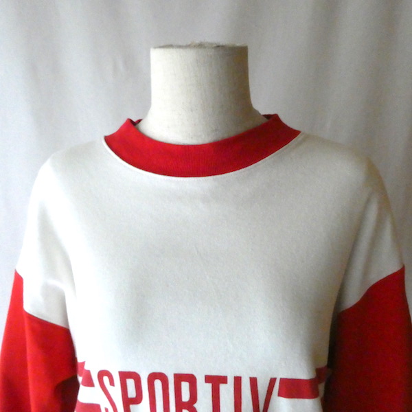 エスプリのロンTです。白赤のコンビで、胸元には2本ラインとフランス語で『sportive』のプリント。アームホール太めの身幅広めで、着ると裾の浮き感が可愛いアイテム。白部分に赤い色移りがあるので、ダメージ画像でご確認ください。