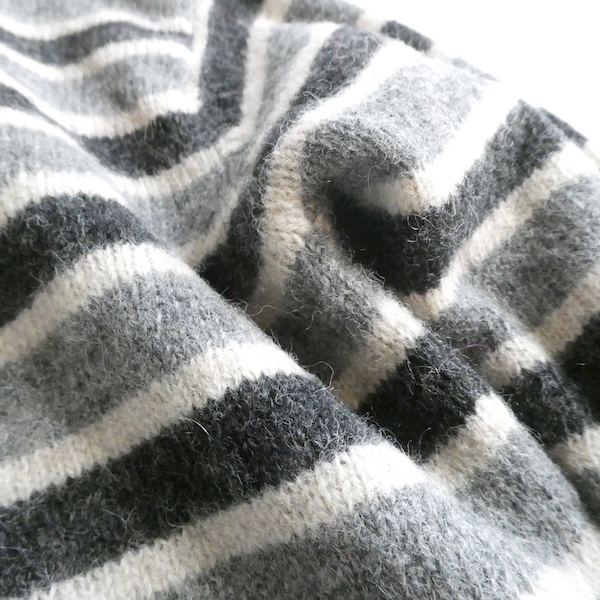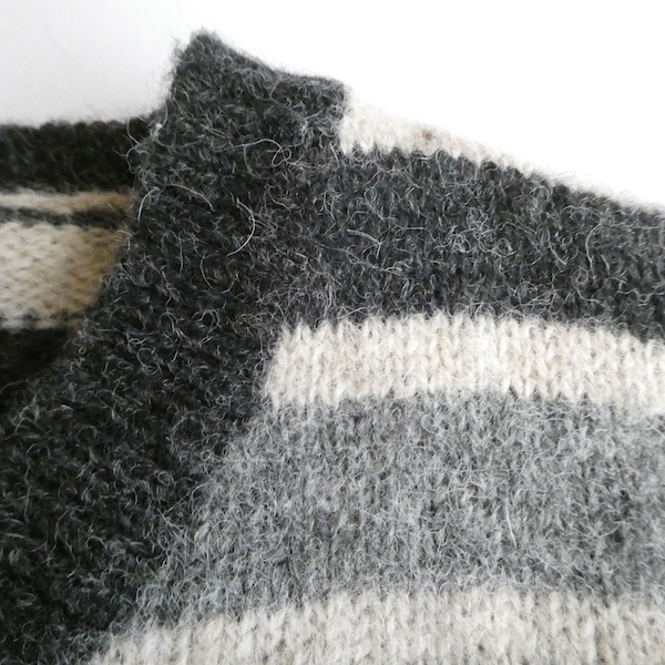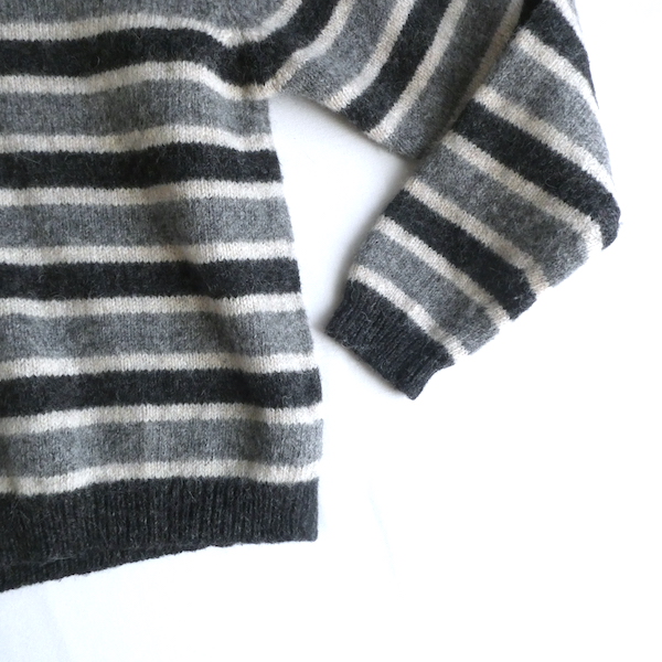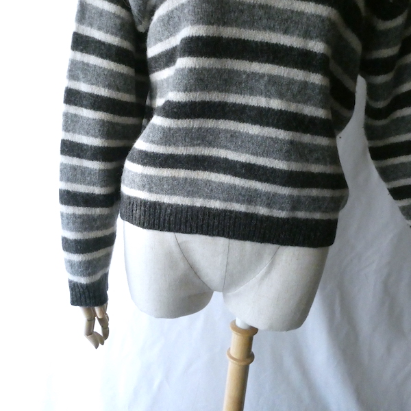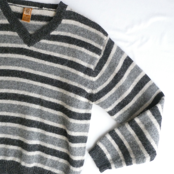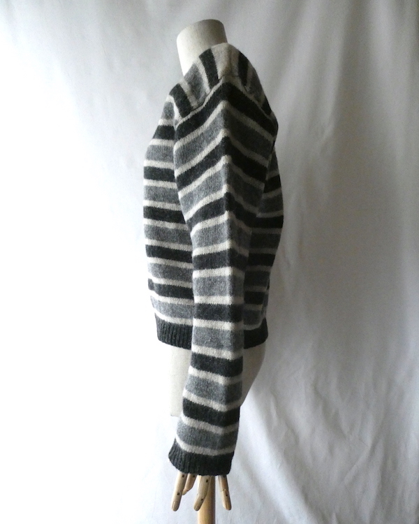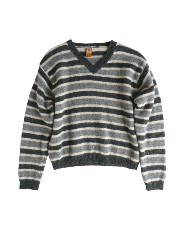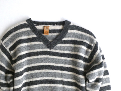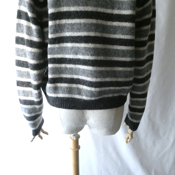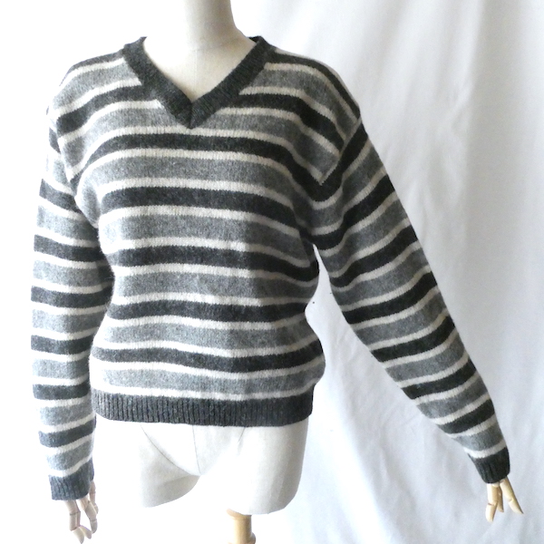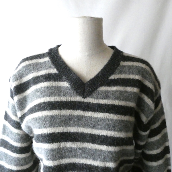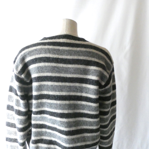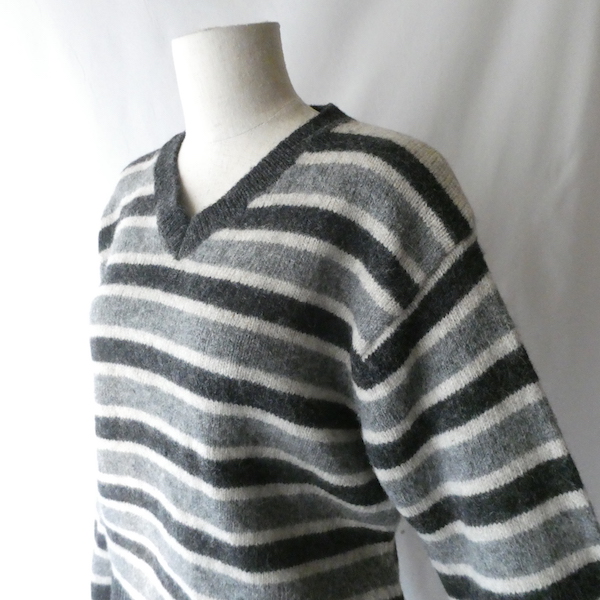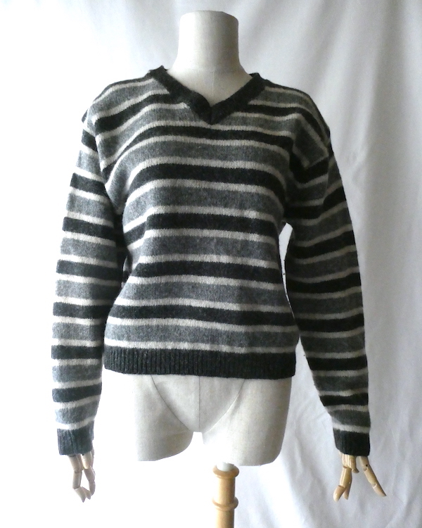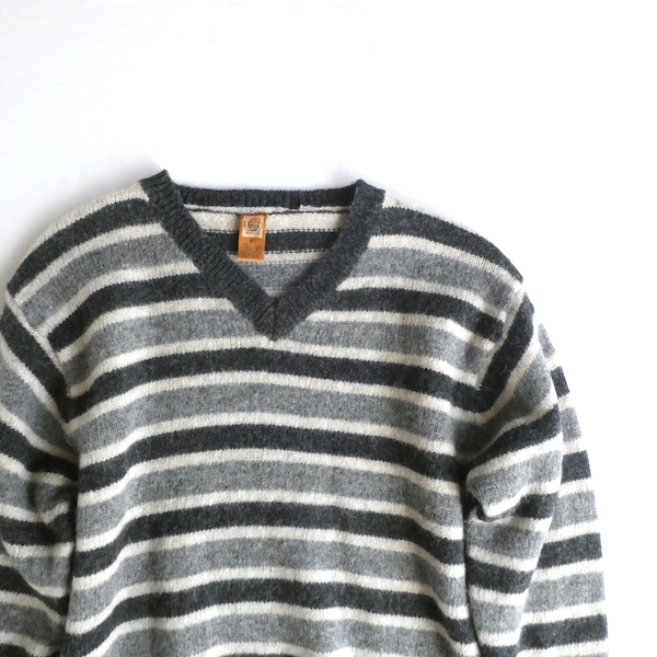 シェットランドウールのVネックニットです。白〜グレーグラデーションのボーダー。身幅は有りますが、比較的コンパクトなサイズ感。裾の絞りもなくレイヤードもし易いですよ。アウターのインナーにも入れ易いアームの太さです。デイリーに着まわせて便利な一枚。