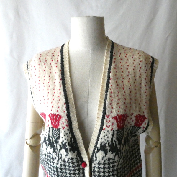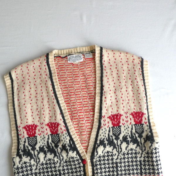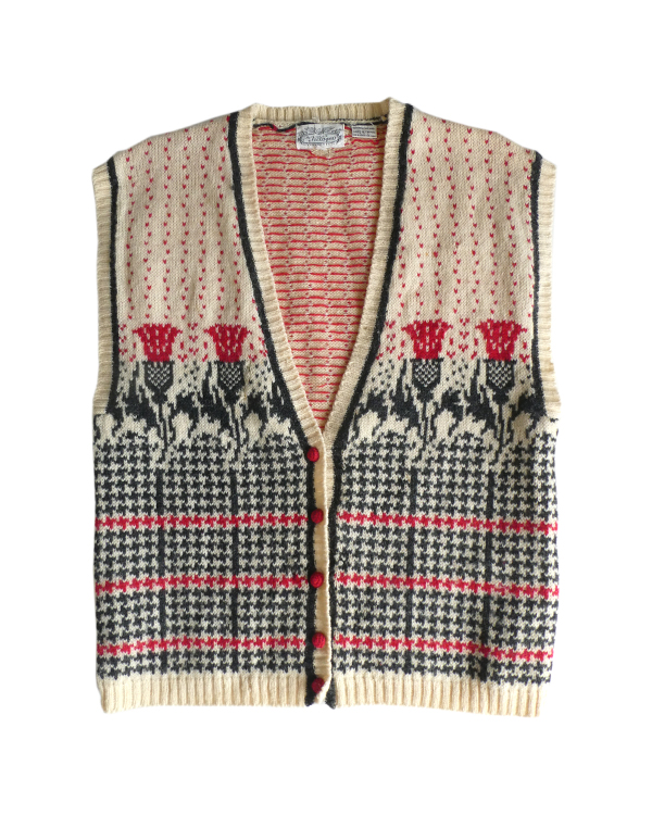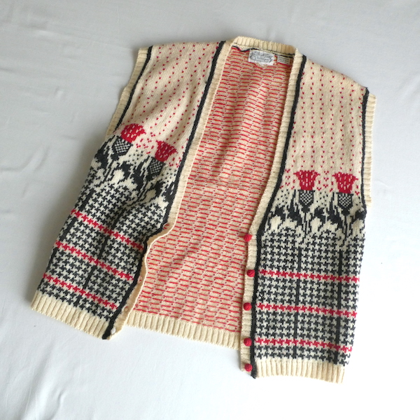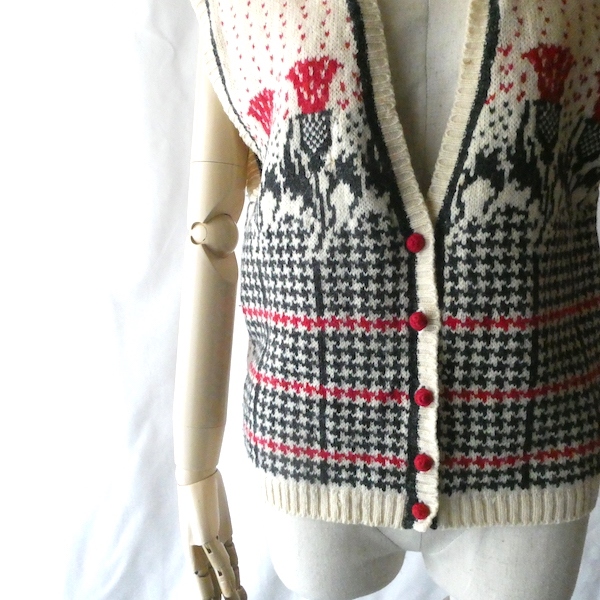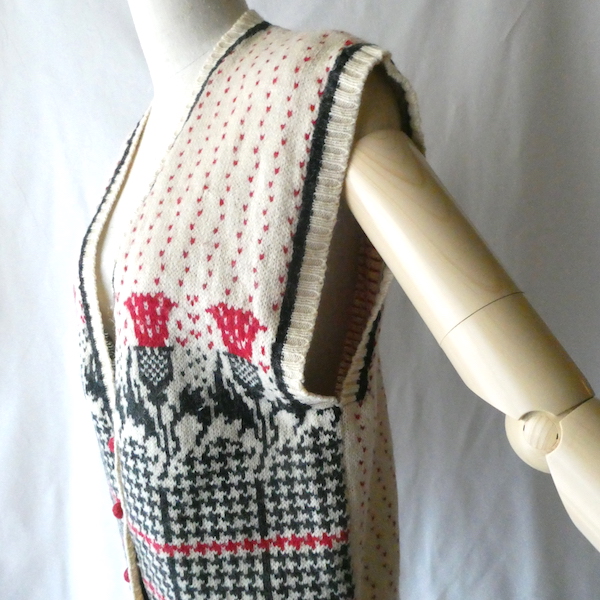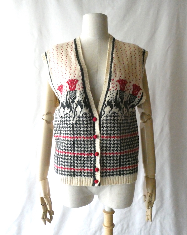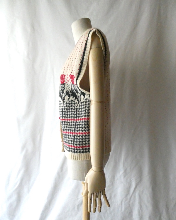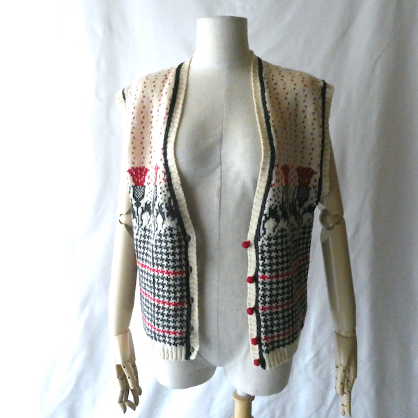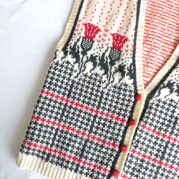 シェットランドウールの薄手ニットベストです。生成色に赤とチャコールグレーの柄入り。一見フェアアイルっぽい雰囲気ですが、よく見るとハウンドトゥースの上にはお花のライン。小さなニットの包みボタンも可愛いですよ。赤が効いていてインナーとしても良い仕事してくれそうです。寒暖差のある時期の調節にも使い易い一枚。