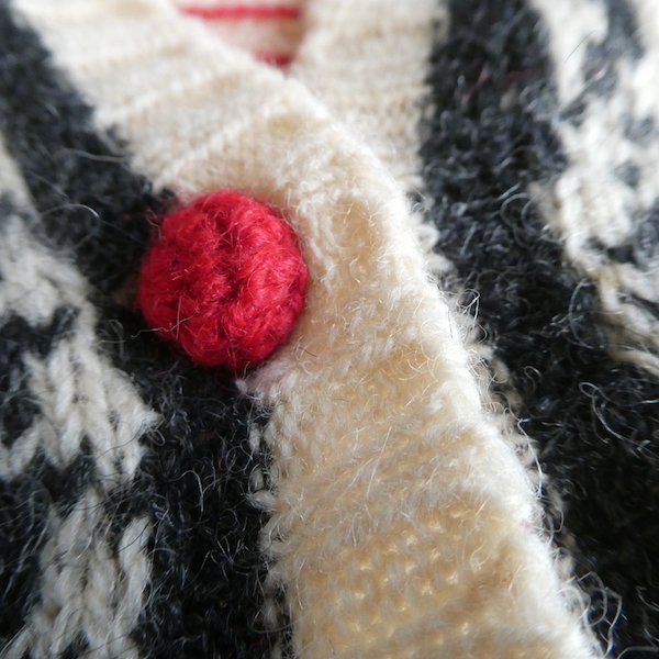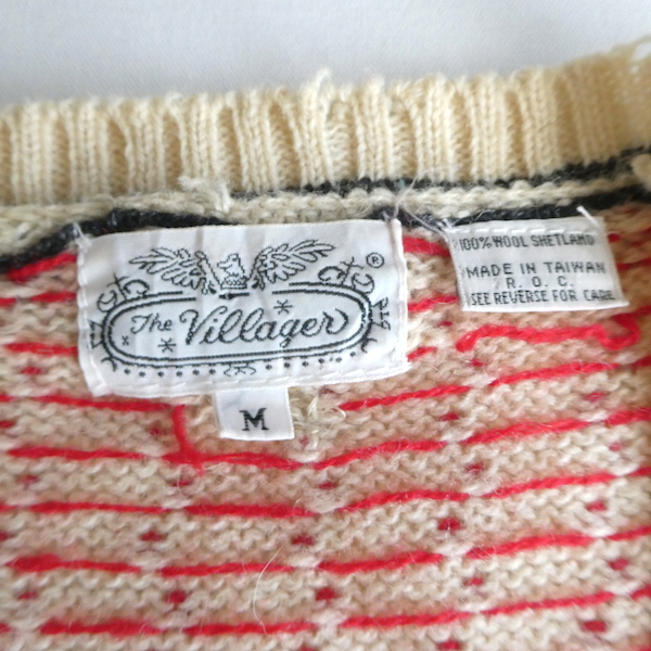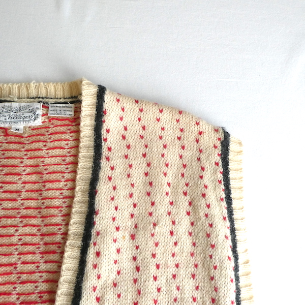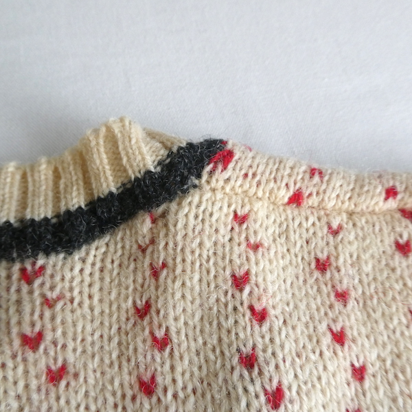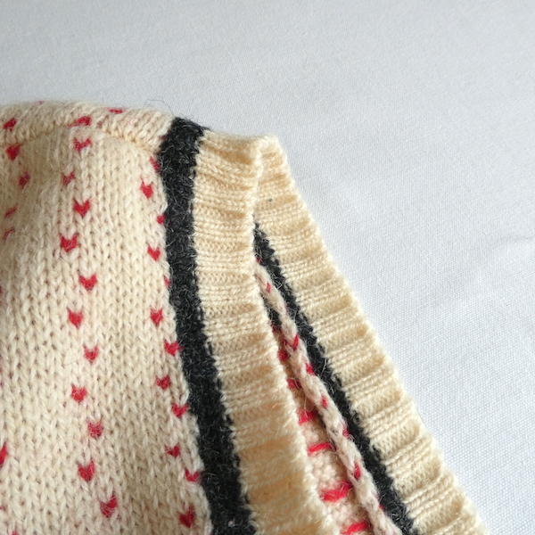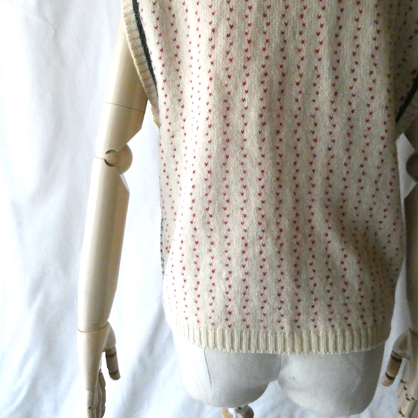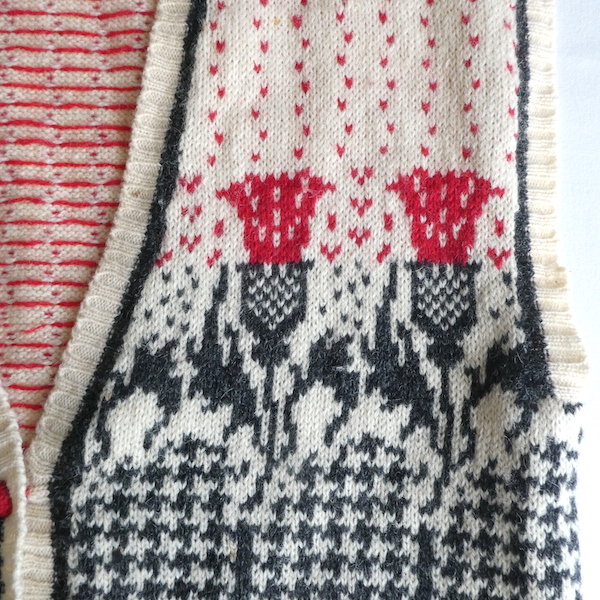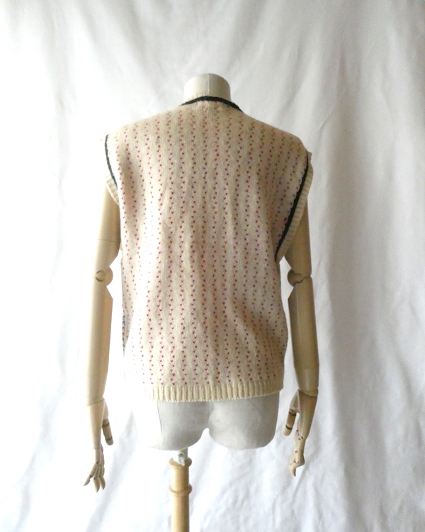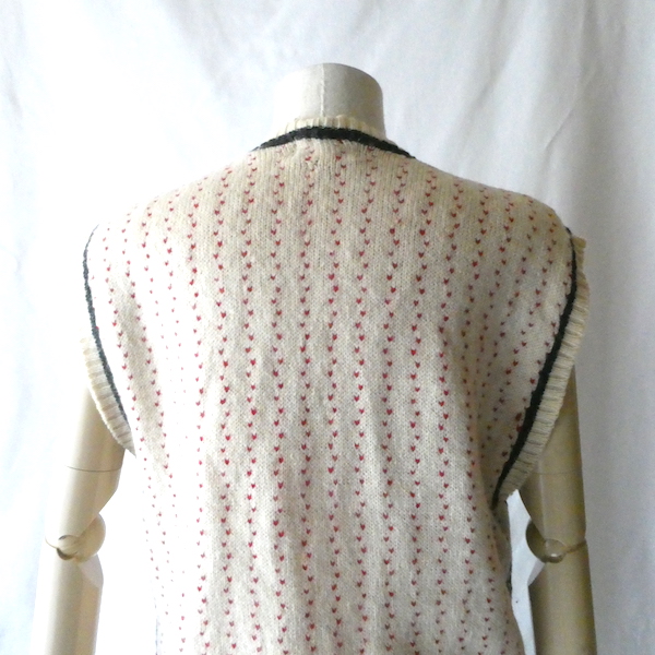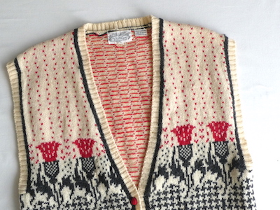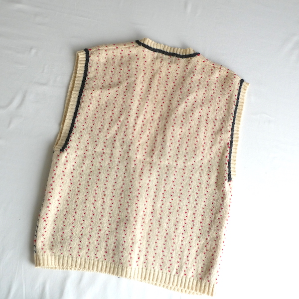 シェットランドウールの薄手ニットベストです。生成色に赤とチャコールグレーの柄入り。一見フェアアイルっぽい雰囲気ですが、よく見るとハウンドトゥースの上にはお花のライン。小さなニットの包みボタンも可愛いですよ。赤が効いていてインナーとしても良い仕事してくれそうです。寒暖差のある時期の調節にも使い易い一枚。
