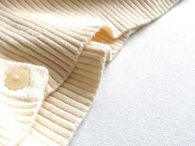 生成色のVネックカーディガン。インナーの色があまり透けない程度に厚みの有る、しっかり目コットンリブ素材。伸縮性自体は緩めなのでピタッとし過ぎず着れます。ボタンを全閉じしてカットソー感覚でも◎。夏場の冷房対策にも使えて便利な一枚です。