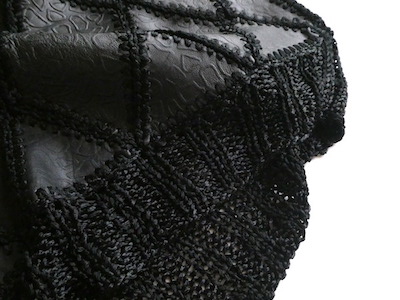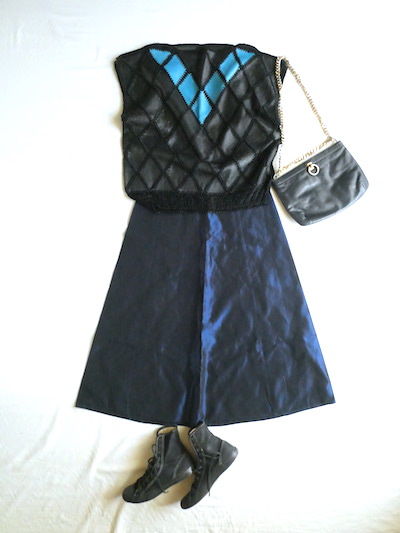 レザーパッチワークのトップスです。型押しで柄の入ったブラックレザーと綺麗な水色レザーの組み合わせ。ダイヤ型のレザーパーツを光沢のあるレーヨンニットで継ぎ合わせてあります。70年代のフォークロア物とは、また違った魅力のあるアイテム。一枚でもベストとして重ねても◎。