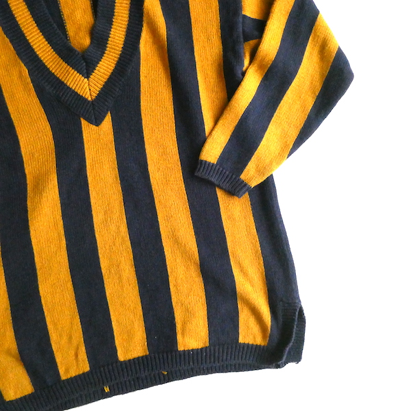 Vネックのストライプニットです。マスタードイエローとネイビーの太めストライプ。コットン・麻混の素材でサラッとゆるっとした着心地です。大きめにゆるっとお尻が隠れるくらいの着丈。リブ等の絞りも無くボトムのボリュームを選ばない合わせ易いシルエットです。真夏以外の長いシーズンでお使い頂けそうなアイテム。