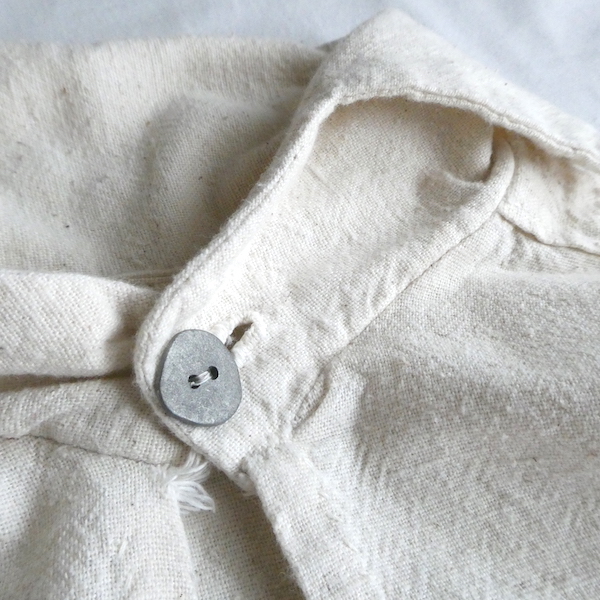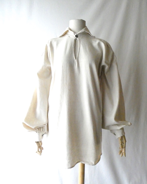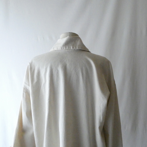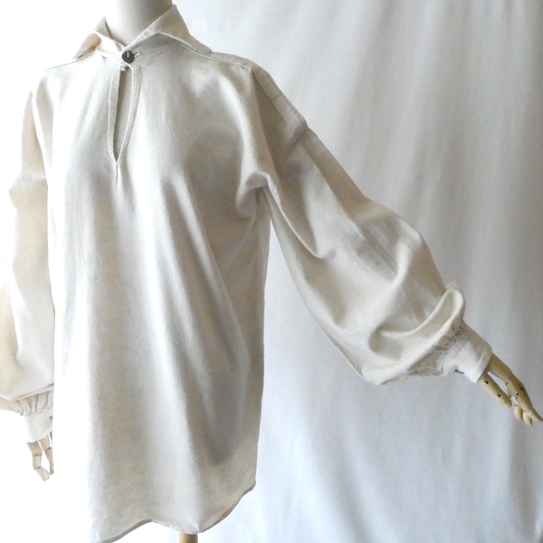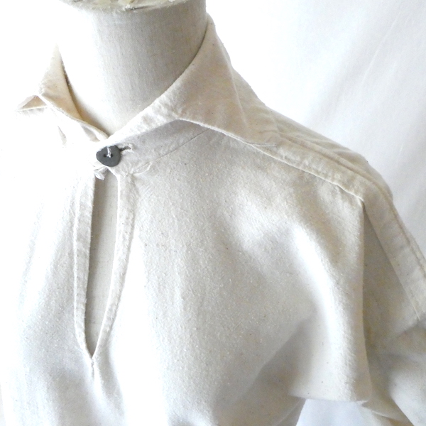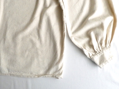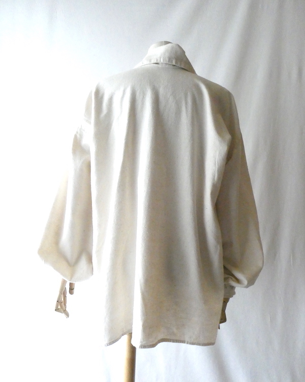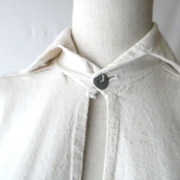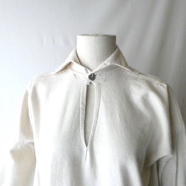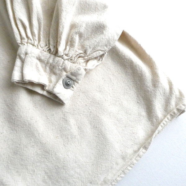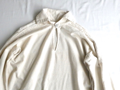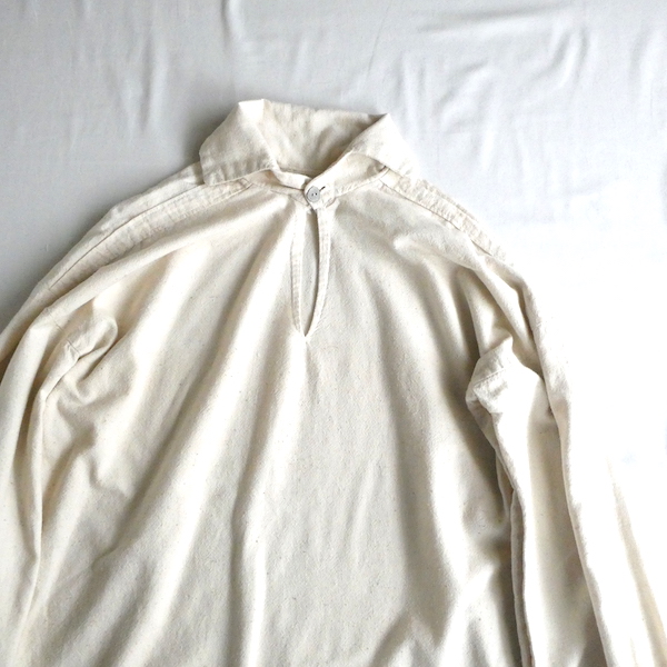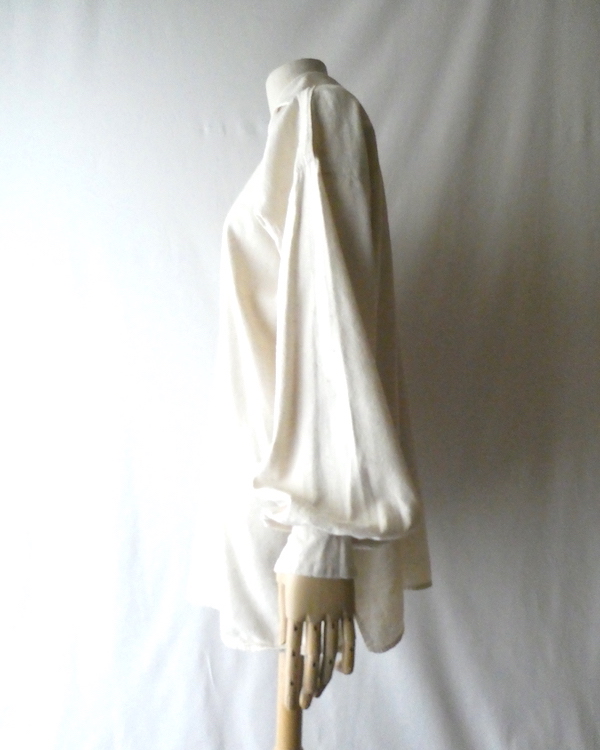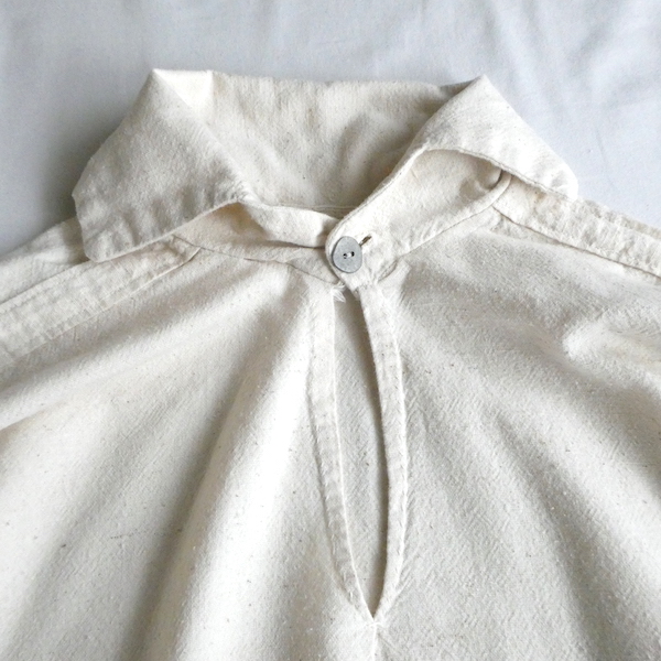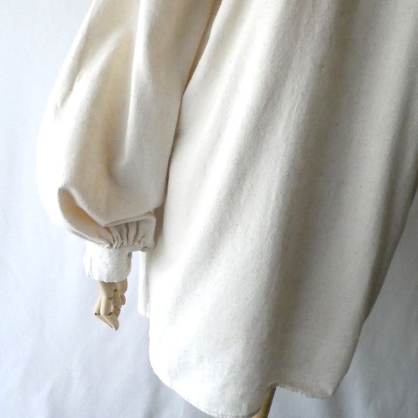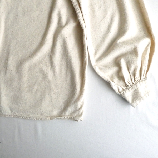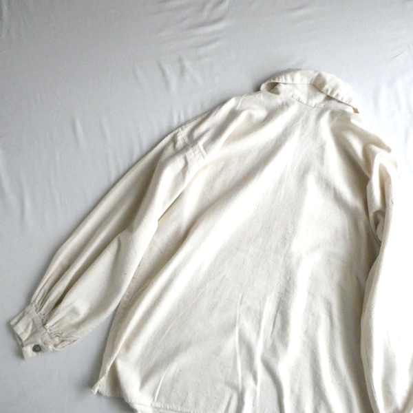 ビッグシルエットの長袖シャツです。サラッと生成色のコットン生地。膝上くらいの丈感でガブっと着られるサイズ感です。襟のデザインが少し変わっていて、台襟のようにほんのり立ち上がりますが開き気味のデザイン。ボリュームのあるパフスリーブにメタルボタン。ナチュラルな生成り生地が可愛いアイテムです。