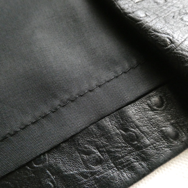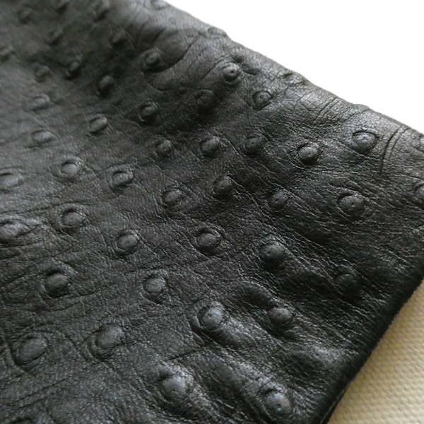 型押しのリアルレザーのスカートです。ブラックレザーにオーストリッチの型押し。ベルト無しの90年代らしいデザインのアイテム。型押しですが、安っぽさの無いしっかりランダムなオーストリッチ柄で、レザー質もしっとりした質感です。膝〜膝下丈くらい。合わせ易いブラックなので、質感を挿す感じで使い易いですよ。