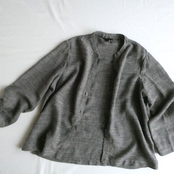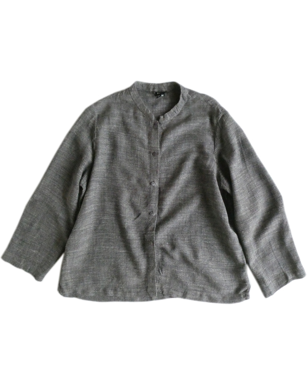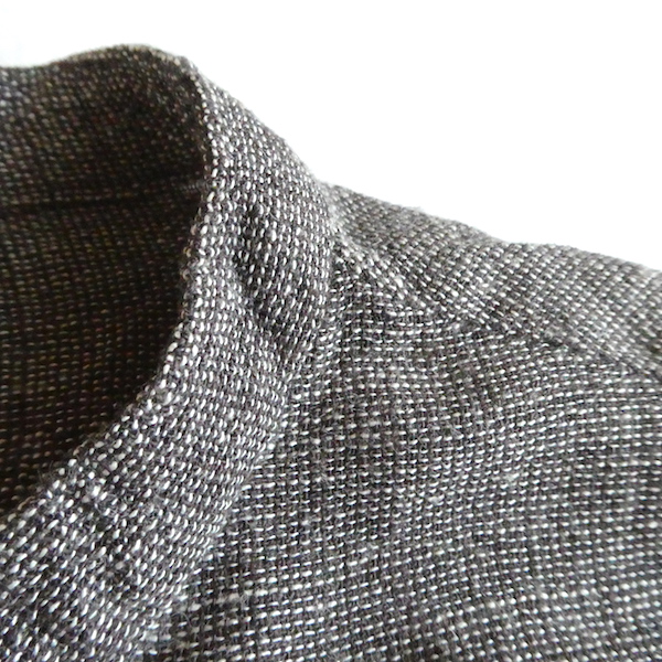 薄手のシャツジャケットです。白黒糸が点々と重なるモノトーンの織り地。レーヨン(ヴィスコース)リネンでゆるんと薄手でリラックス出来る着心地のアイテム。ジャケットというよりは、どちらかというとシャツの感覚です。ボタンを全閉じしてシャツとしても、軽く羽織ってジャケットにと季節の狭間にも便利です。