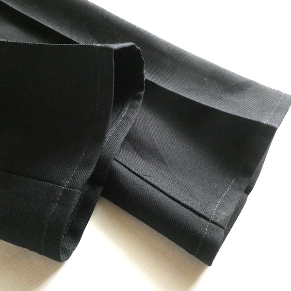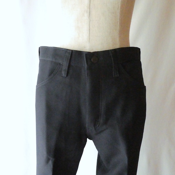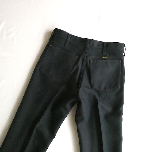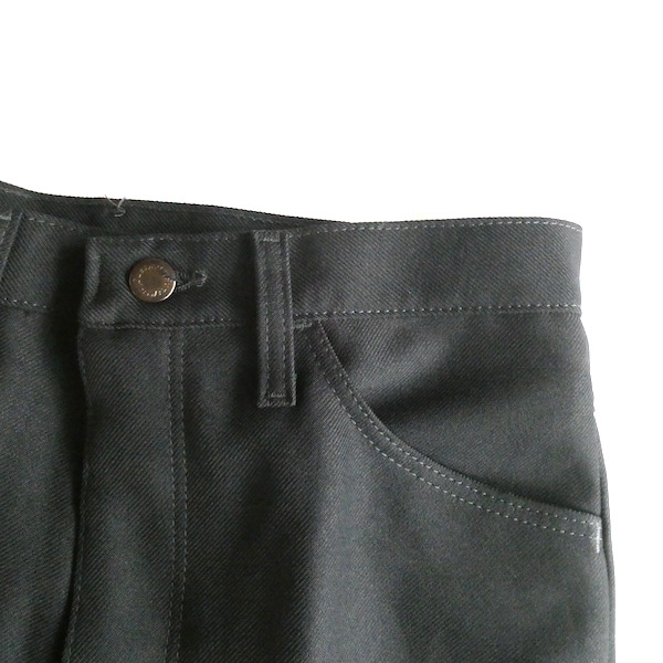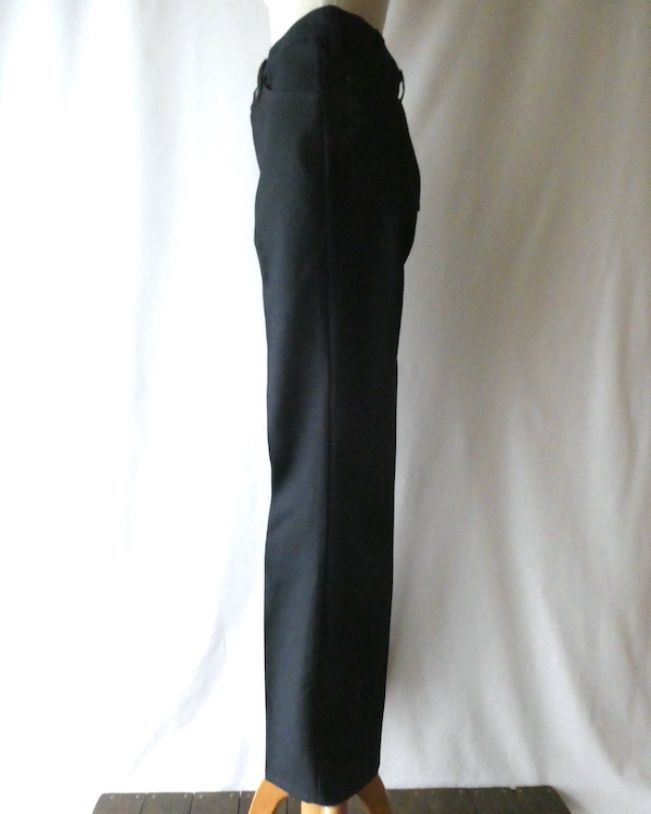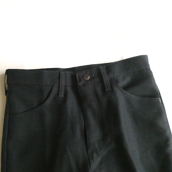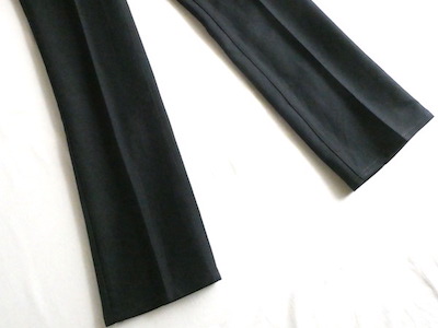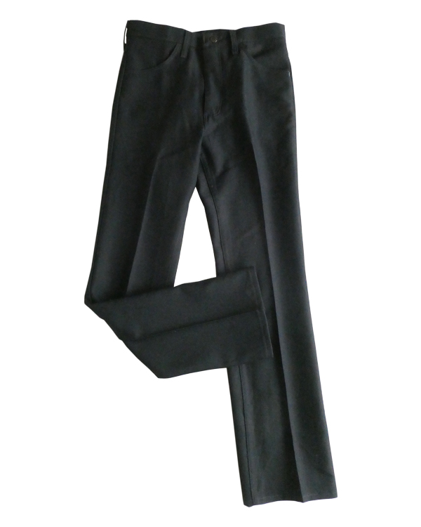 ラングラーのフレアスラックスです。ほぼ黒ですが光の加減で少しネイビー寄りにも見えるような色味。センタープレス入りのスッキリ細身なフレアシルエット。細身の腰回りと太ももから、ストンと綺麗に落ちます。ヒール等にも合わせ易いですよ。メキシコ製です。
