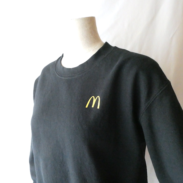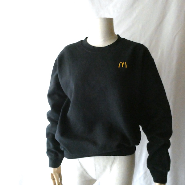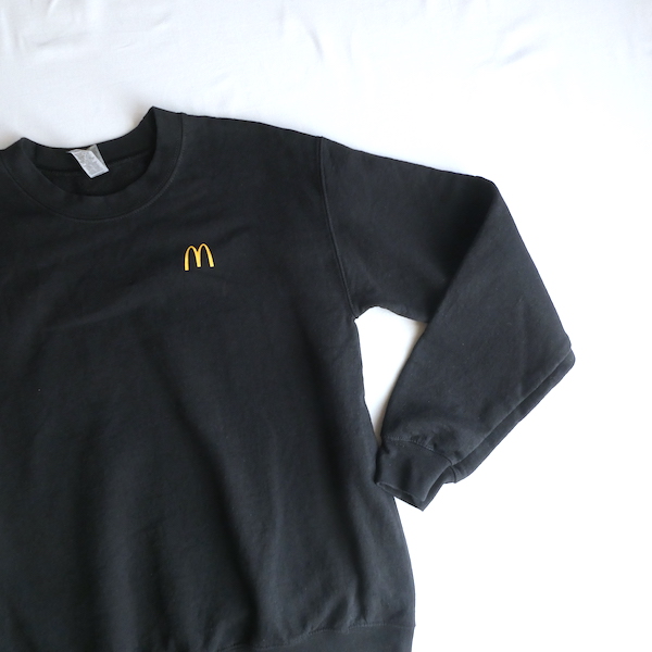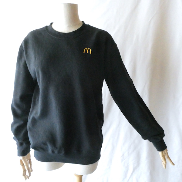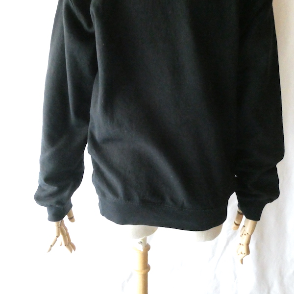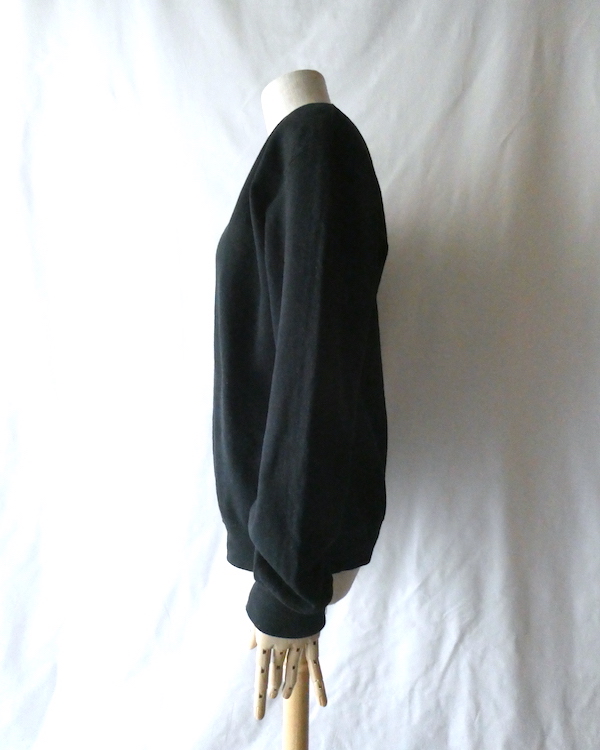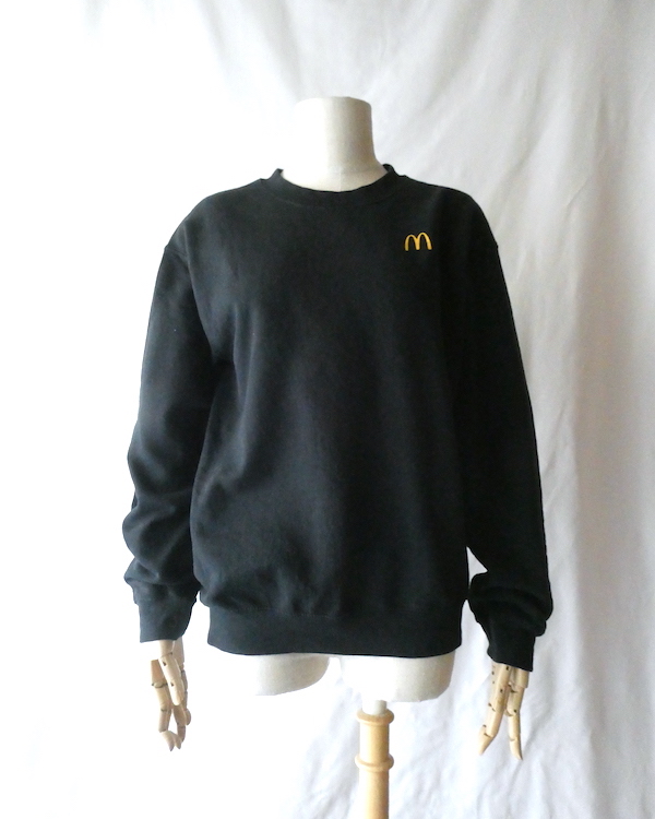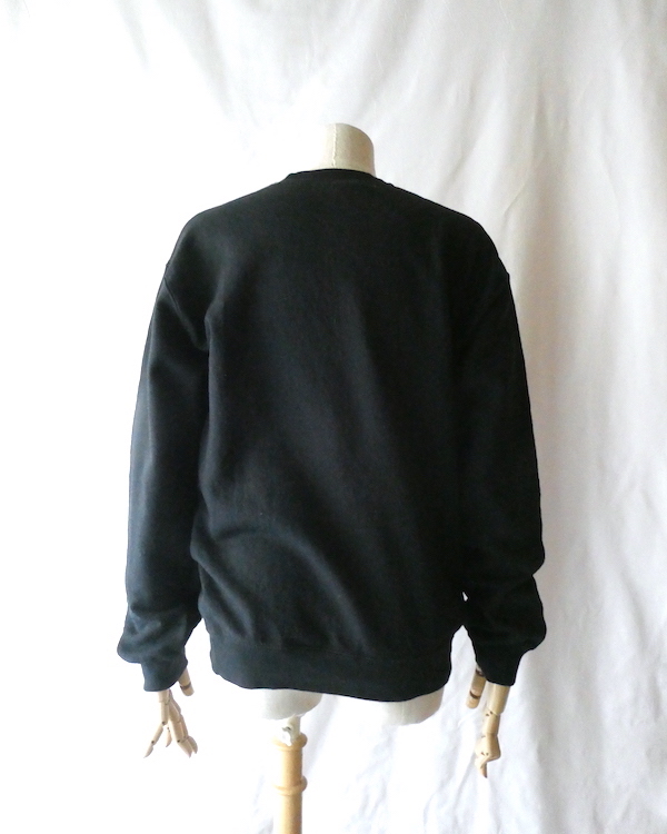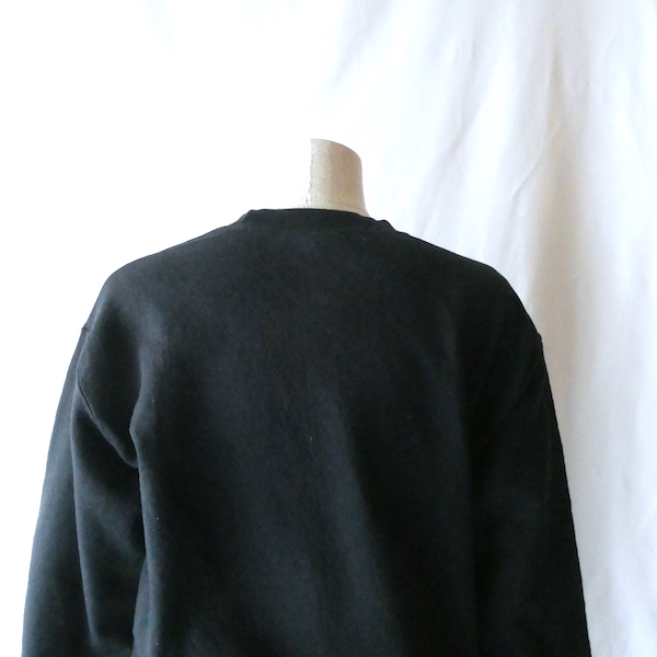 大きめサイズのブラックスウェット。身幅も広めでリブの長さも短め、インナーを入れたりレイヤードし易いシルエットです。左胸に付いた小さなイエロー『M』がポイント。まだ黒が残る感じの色落ちで程良い綺麗めのこなれ感です。