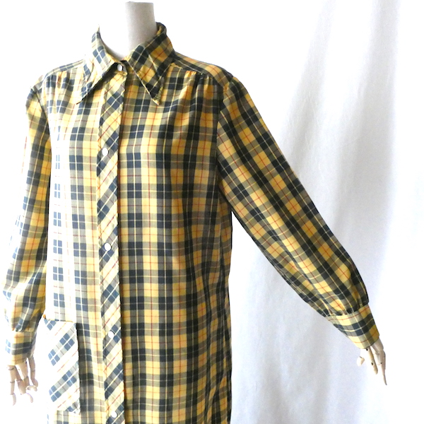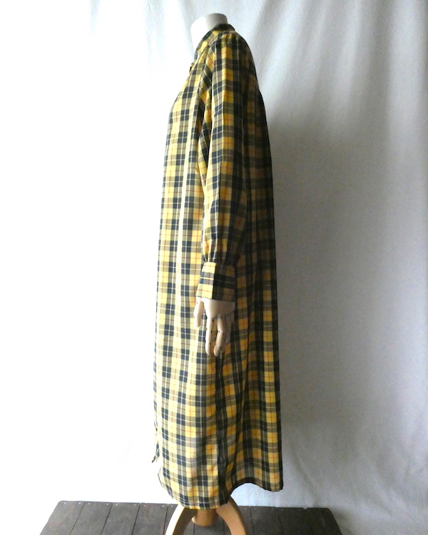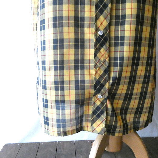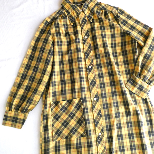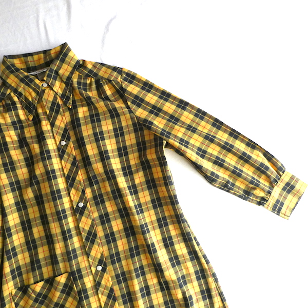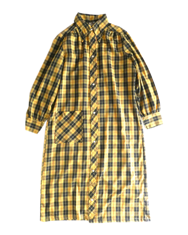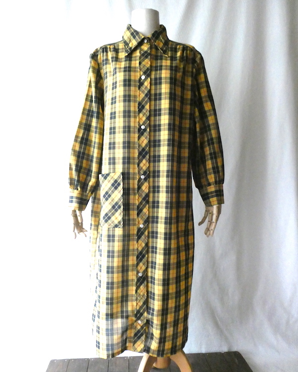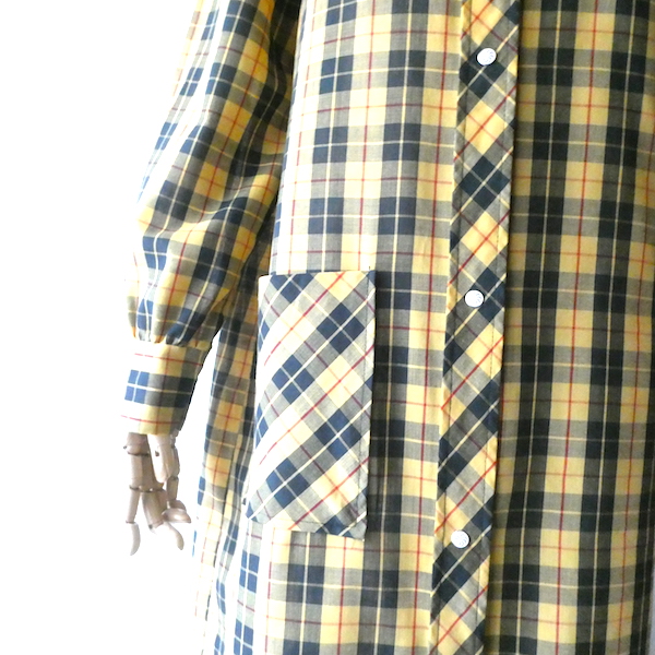 薄手ポリコットンのワンピース。イエロー・ブラックに赤いラインが入ったチェック柄。フロントはスナップボタン留めで、お花のような風車のような模様がエンボスに入ります。大きなパッチポケットは右側だけ。この雰囲気のデザインですが衿芯が入ります。フロント全開するので羽織りとしても使い易いですよ。