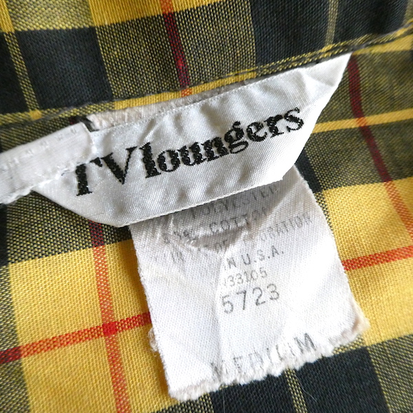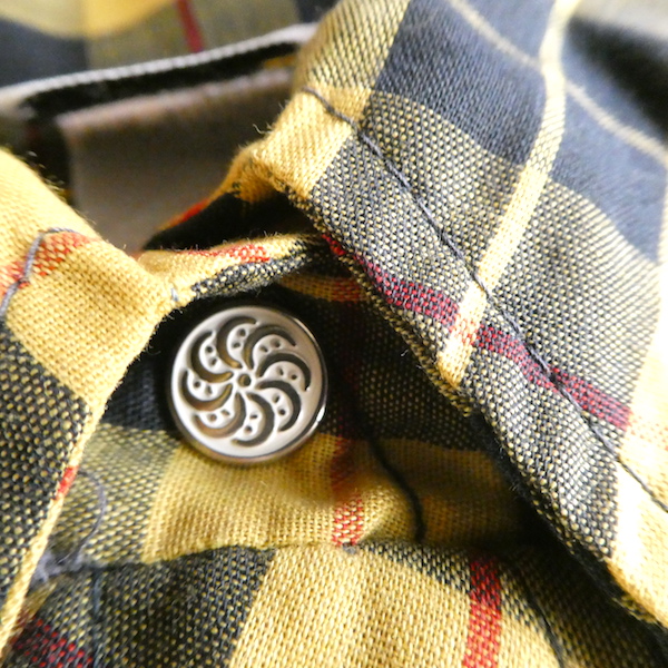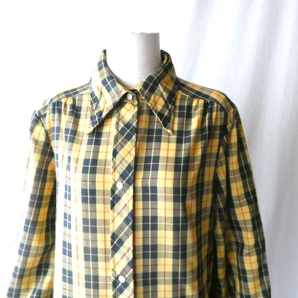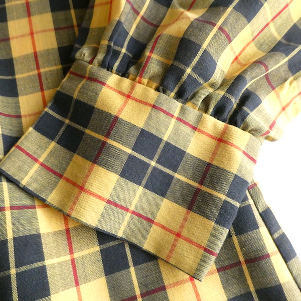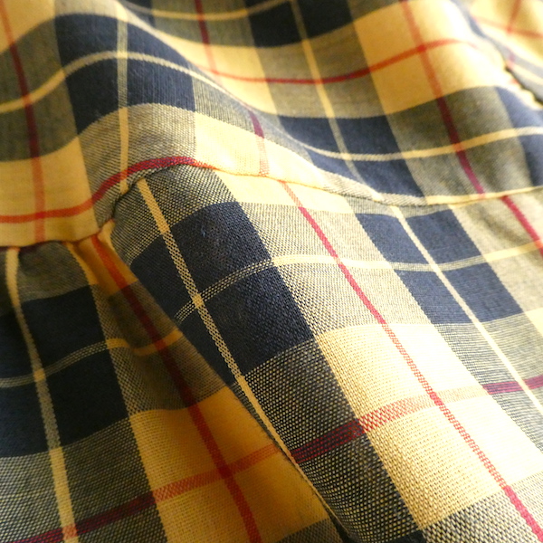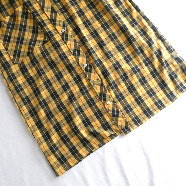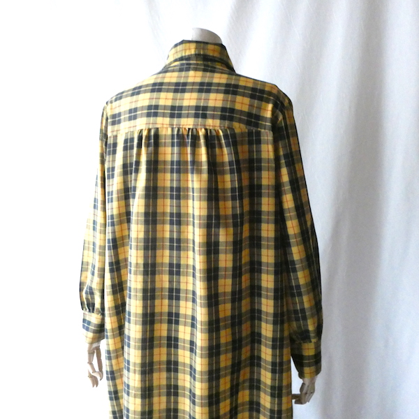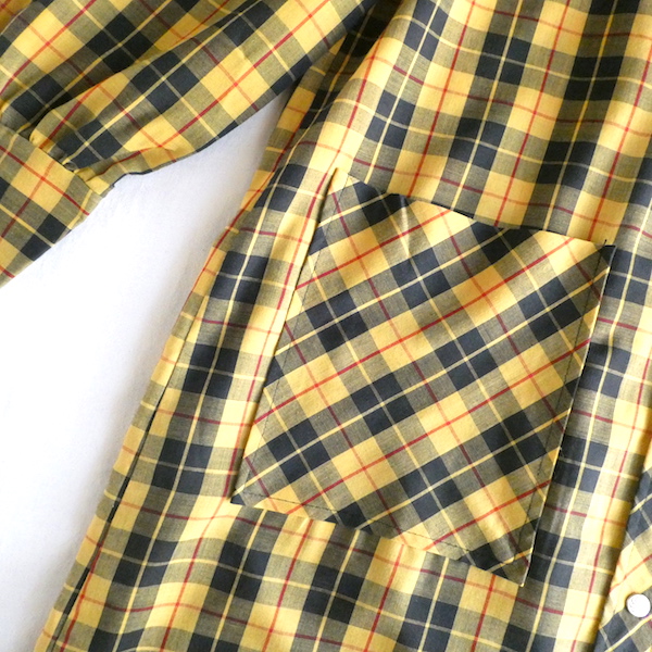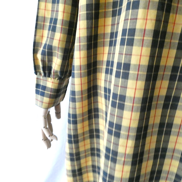 薄手ポリコットンのワンピース。イエロー・ブラックに赤いラインが入ったチェック柄。フロントはスナップボタン留めで、お花のような風車のような模様がエンボスに入ります。大きなパッチポケットは右側だけ。この雰囲気のデザインですが衿芯が入ります。フロント全開するので羽織りとしても使い易いですよ。