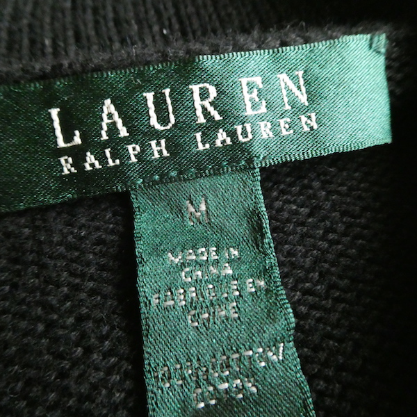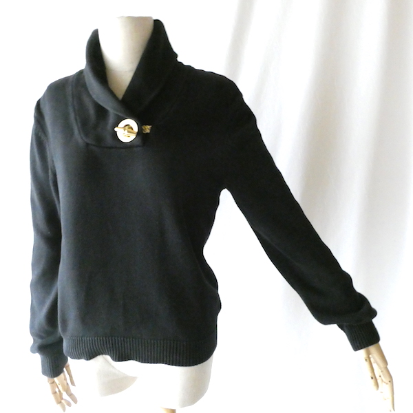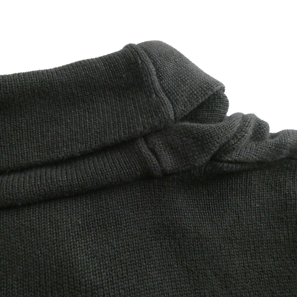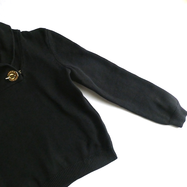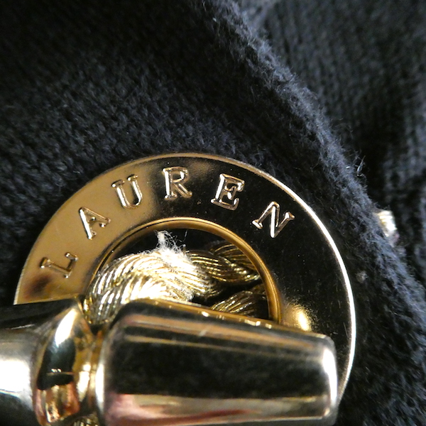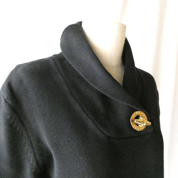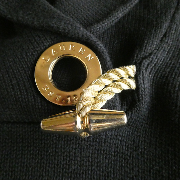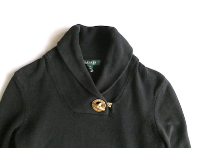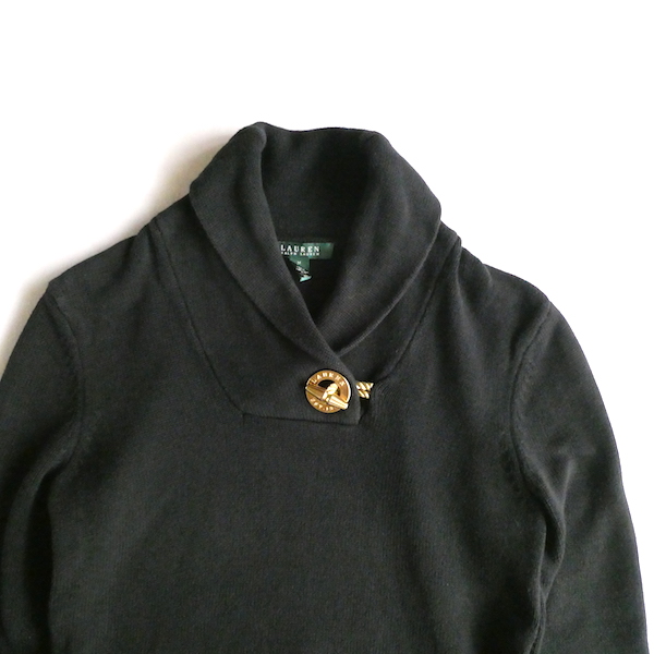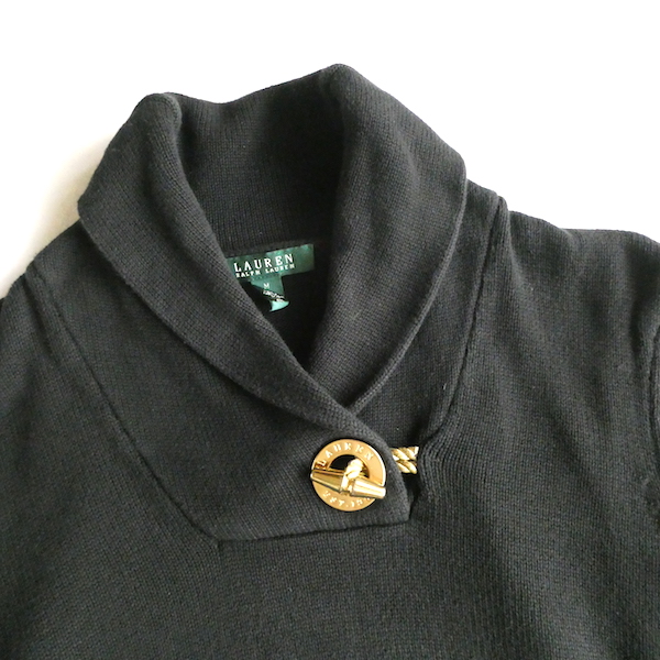 ラルフ・ローレンのコットンニットです。ブラックコットンのショールカラーニットで、襟元にはゴールドのメタル金具。トグルの輪金部分にはLaurenの刻印入り。トグル留めのロープまでしっかりゴールドなのも雰囲気を壊さずで◎。一見シンプルですが、しっかり主張のあるニットです。