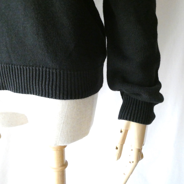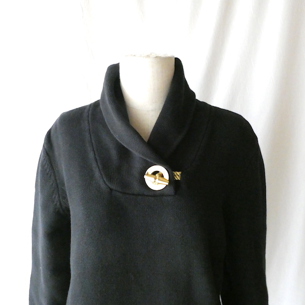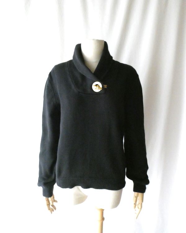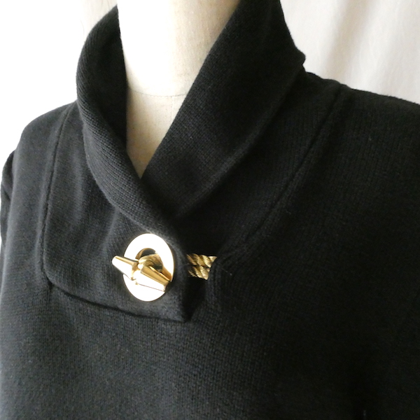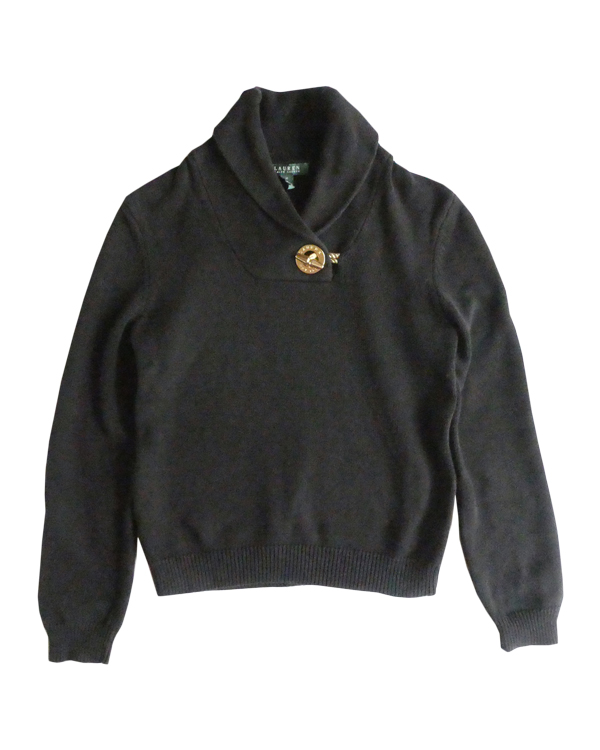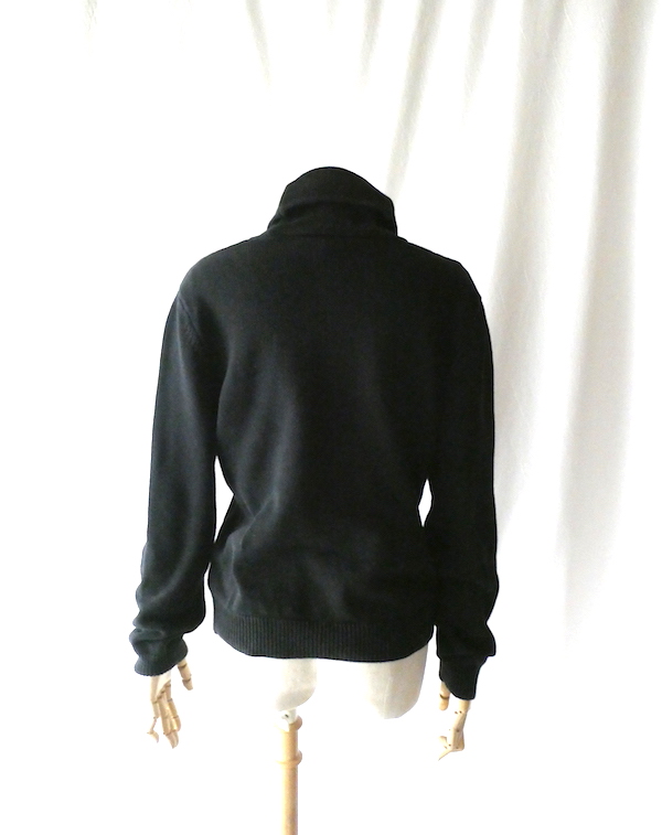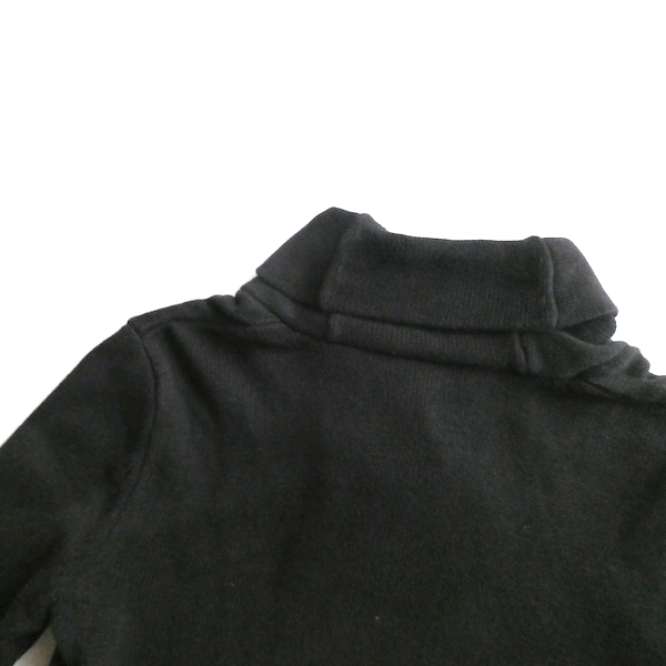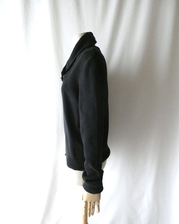 ラルフ・ローレンのコットンニットです。ブラックコットンのショールカラーニットで、襟元にはゴールドのメタル金具。トグルの輪金部分にはLaurenの刻印入り。トグル留めのロープまでしっかりゴールドなのも雰囲気を壊さずで◎。一見シンプルですが、しっかり主張のあるニットです。