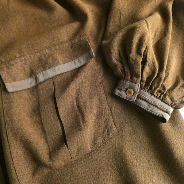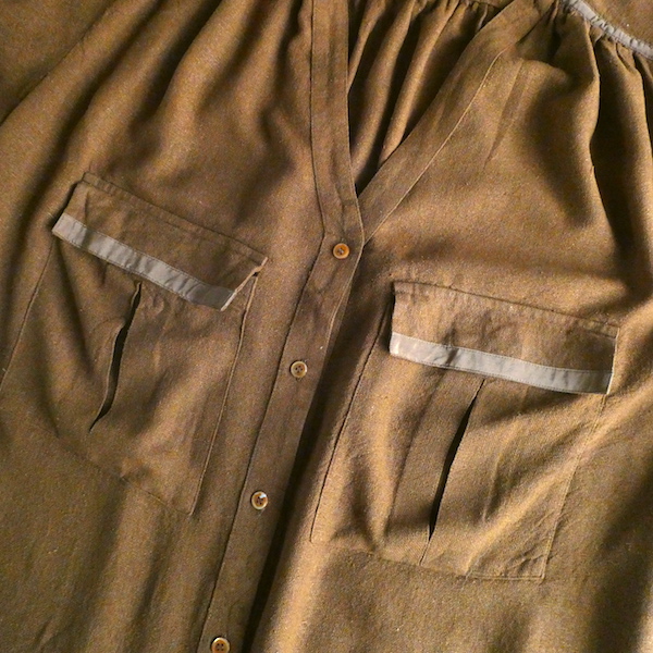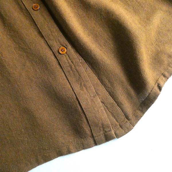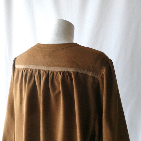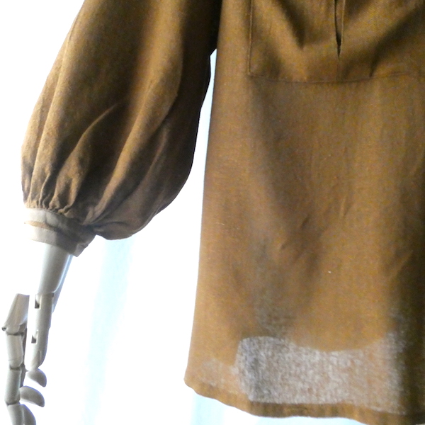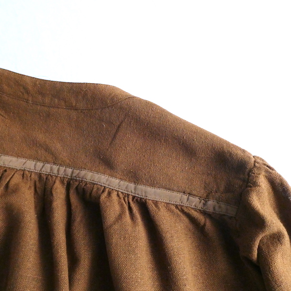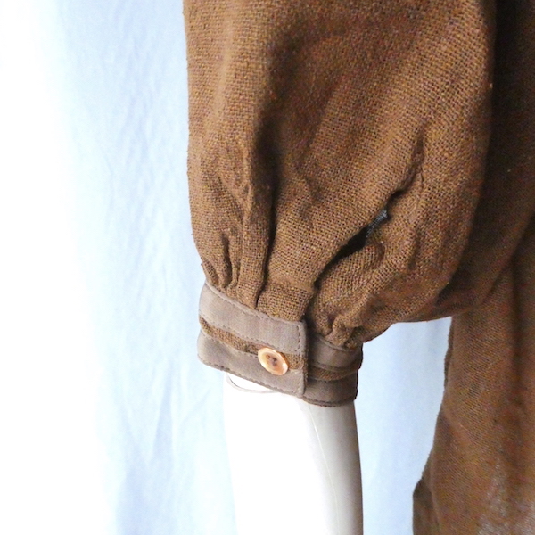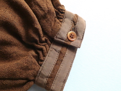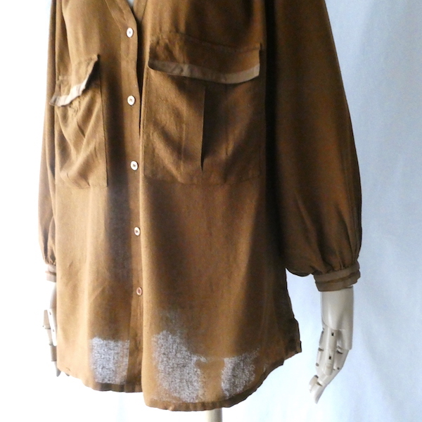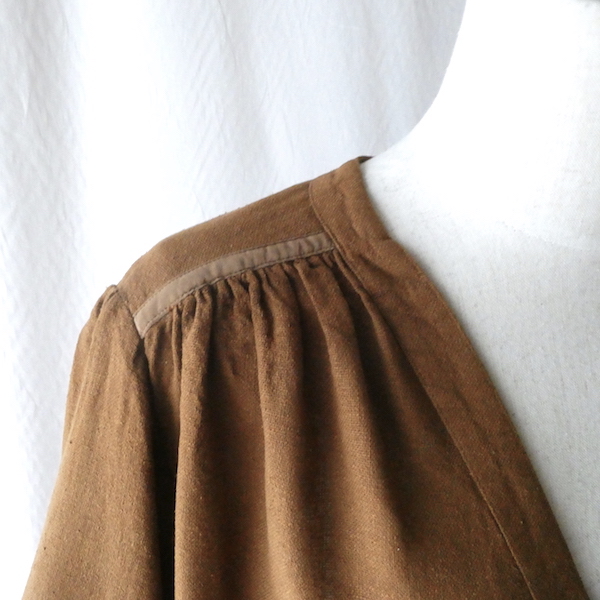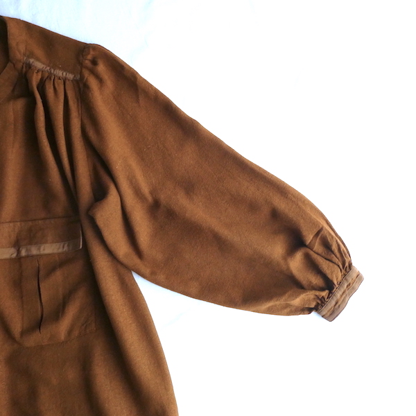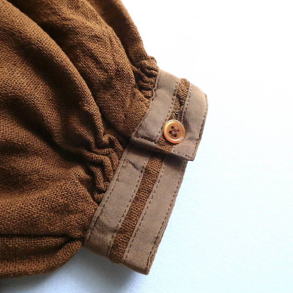 襟無しVネックの長袖ブラウスです。チェスナットブラウンの平織りシルク素材。軽くふんわりとして柔らかいリネンのような質感です。張りのない素材感なのでパフスリーブもゆるっと程良いボリューム。袖口やヨークの切り替え部分には、ブラウンリボンのラインが縫い付けで入ります。襟が無いので羽織るとカーディガンのような雰囲気。季節の変わり目にも便利な一枚です。
