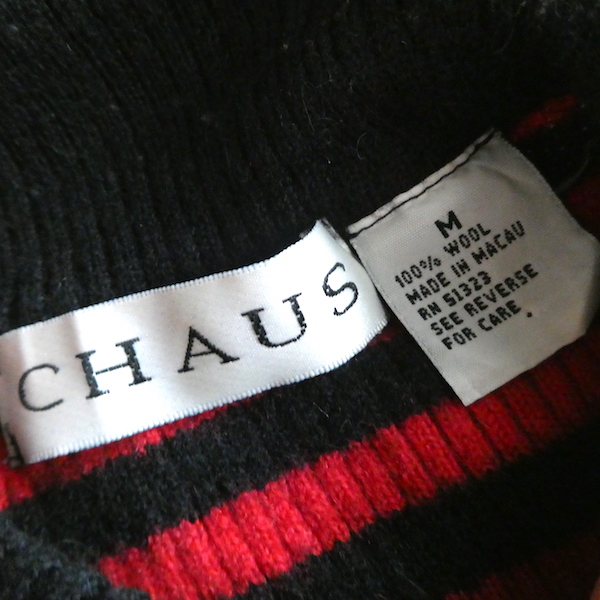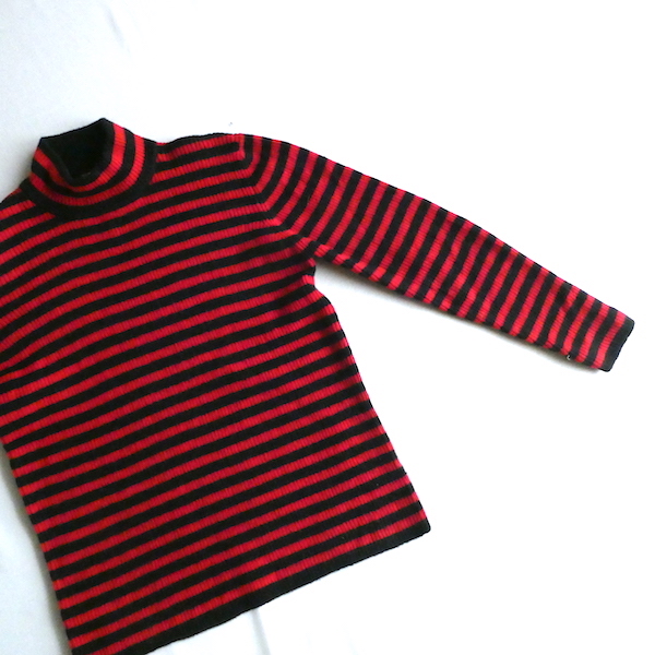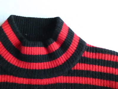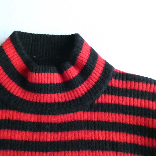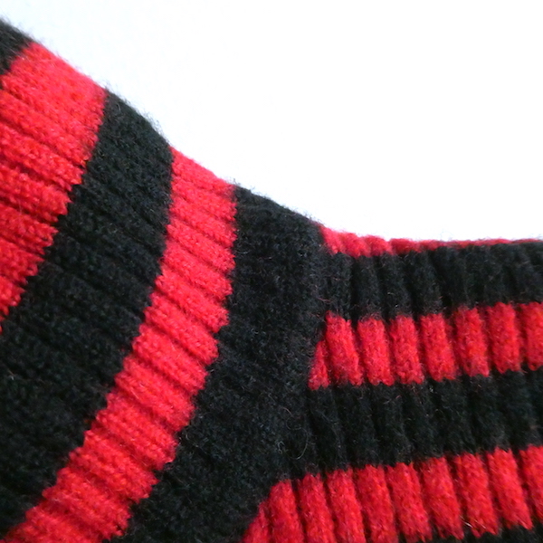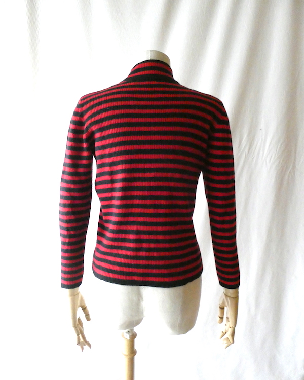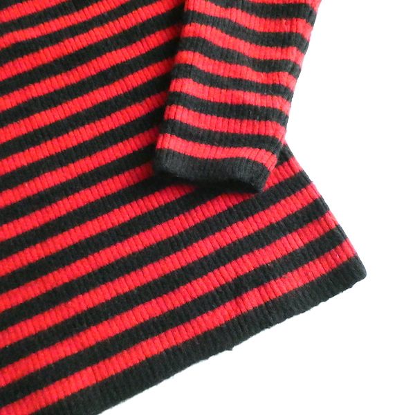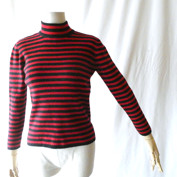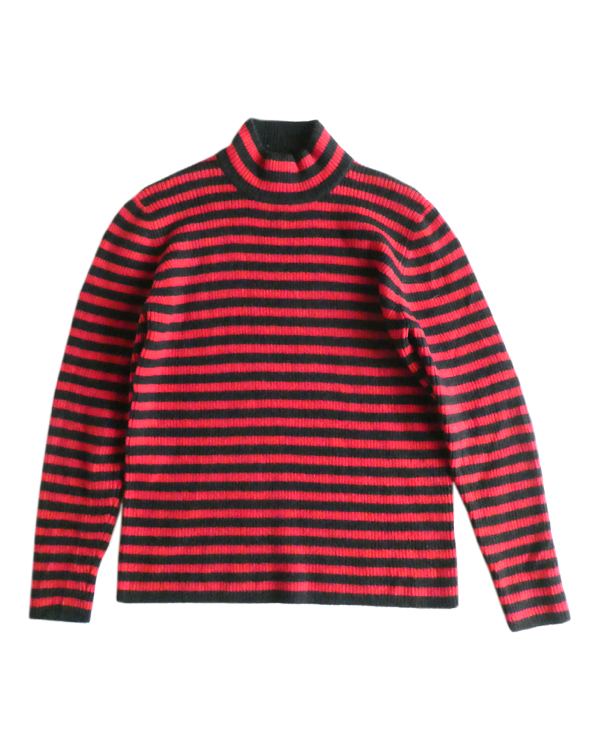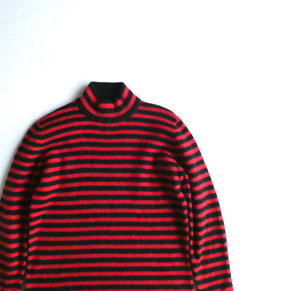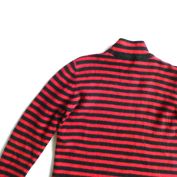 赤黒ボーダーのハイネックニットです。しっかり肉厚なリブで温か(仮にこの素材で白だとしてもインナーが透けなそうな厚さです)古いアイテムではないですが持っていると重宝しそうなアイテム。