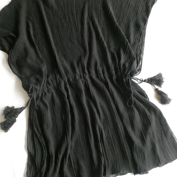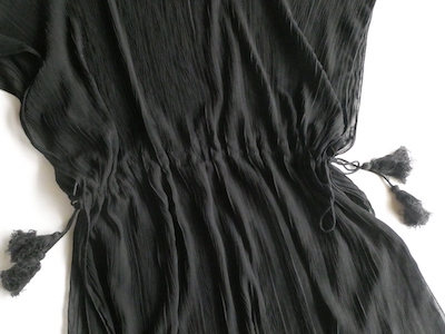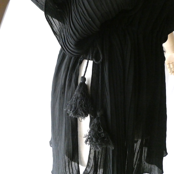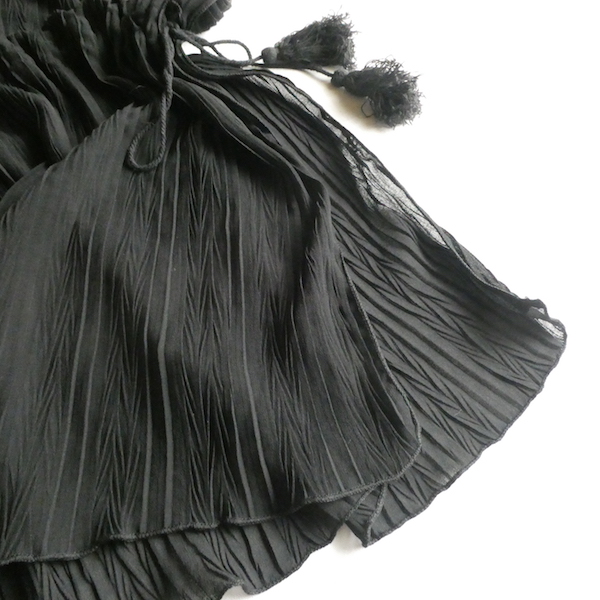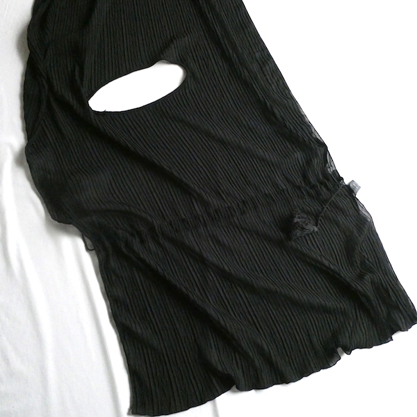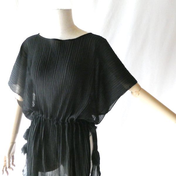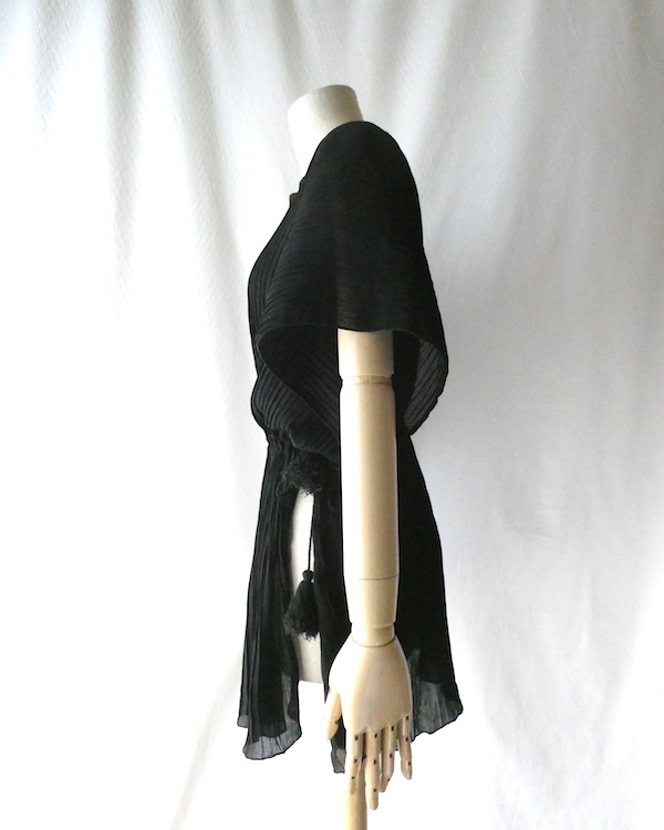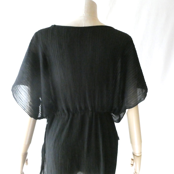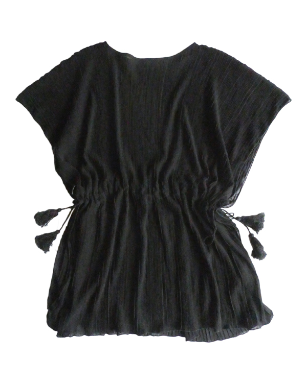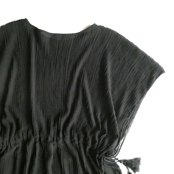 透け感のあるブラックトップスです。ゆるんと落ち感のあるポリエステルで、シワ格好された生地。一枚生地をウエスト部分のドローストリングで留めるポンチョのような作り。絞り加減でブラウジングしたり、そのままゆるっと着たり、タンクやキャミで夏場はそのまま、ワンピースやタートルにベストとして重ね着したり。色々楽しめるアイテム。ドローコードの先についたタッセルが揺れて可愛いですよ。