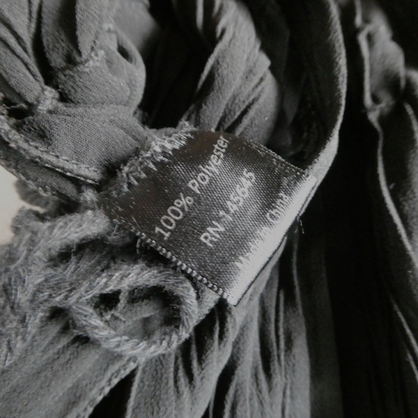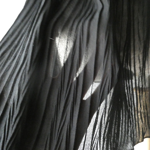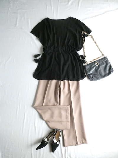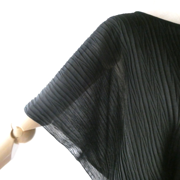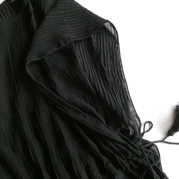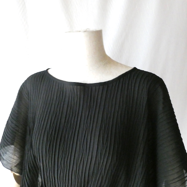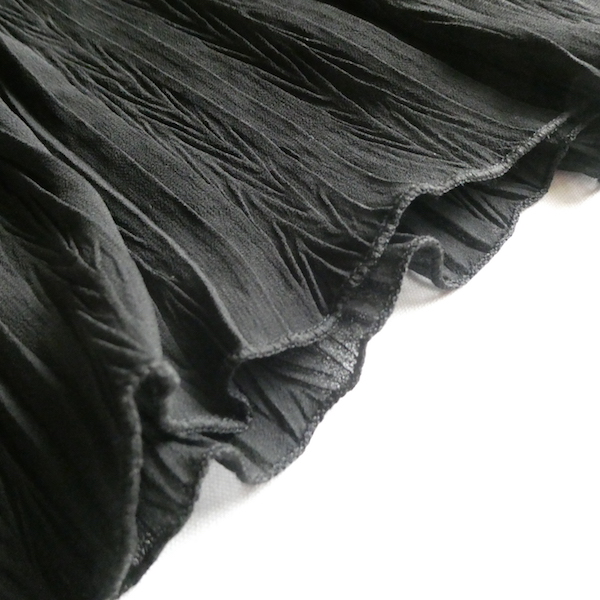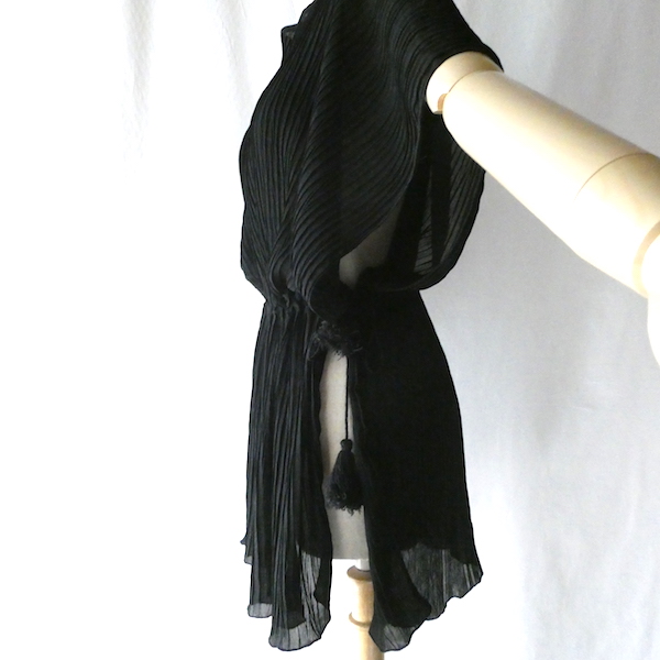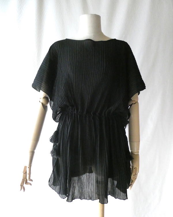 透け感のあるブラックトップスです。ゆるんと落ち感のあるポリエステルで、シワ格好された生地。一枚生地をウエスト部分のドローストリングで留めるポンチョのような作り。絞り加減でブラウジングしたり、そのままゆるっと着たり、タンクやキャミで夏場はそのまま、ワンピースやタートルにベストとして重ね着したり。色々楽しめるアイテム。ドローコードの先についたタッセルが揺れて可愛いですよ。