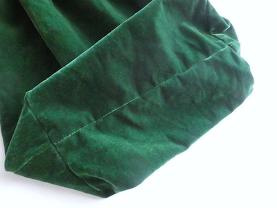 大きめサイズのドローストリングバッグです。深いグリーンのベロア素材。マチ有りで、長さのあるランドリーバッグのような形。生成色のナイロン紐が入ります。キュッと絞ると肩に掛けられる長さがあるのでバッグ代わりにも◎