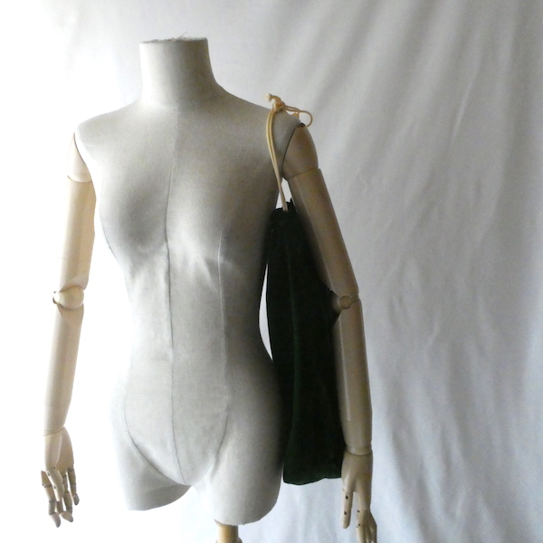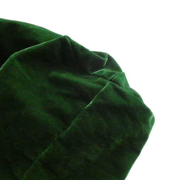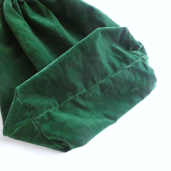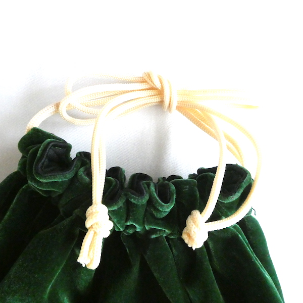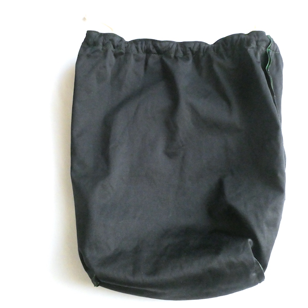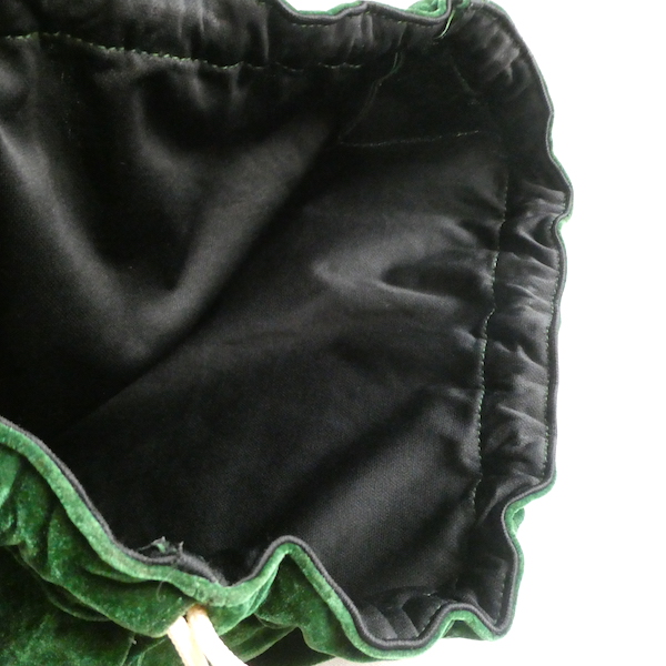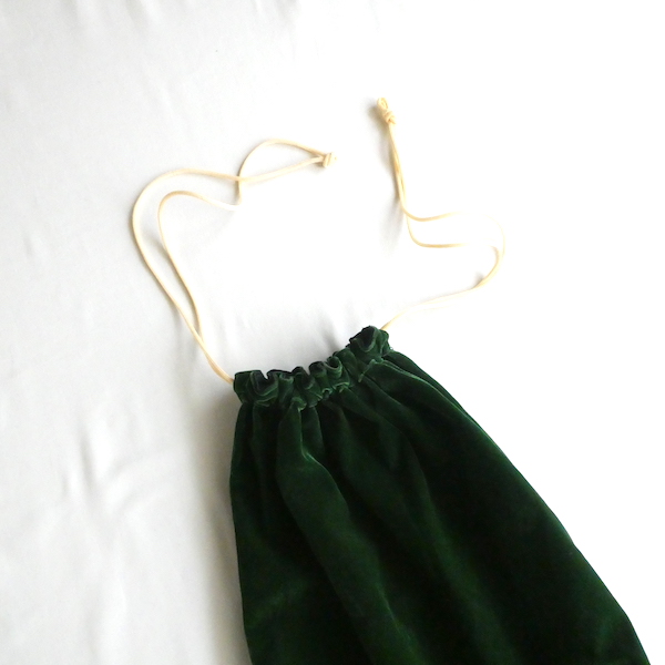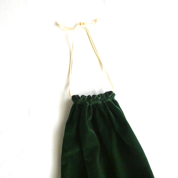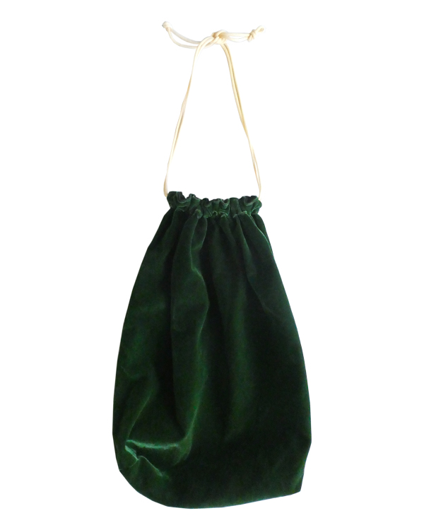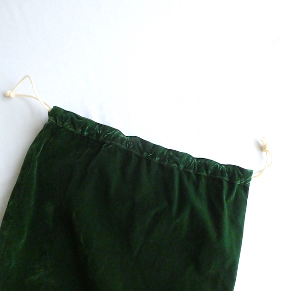 大きめサイズのドローストリングバッグです。深いグリーンのベロア素材。マチ有りで、長さのあるランドリーバッグのような形。生成色のナイロン紐が入ります。キュッと絞ると肩に掛けられる長さがあるのでバッグ代わりにも◎